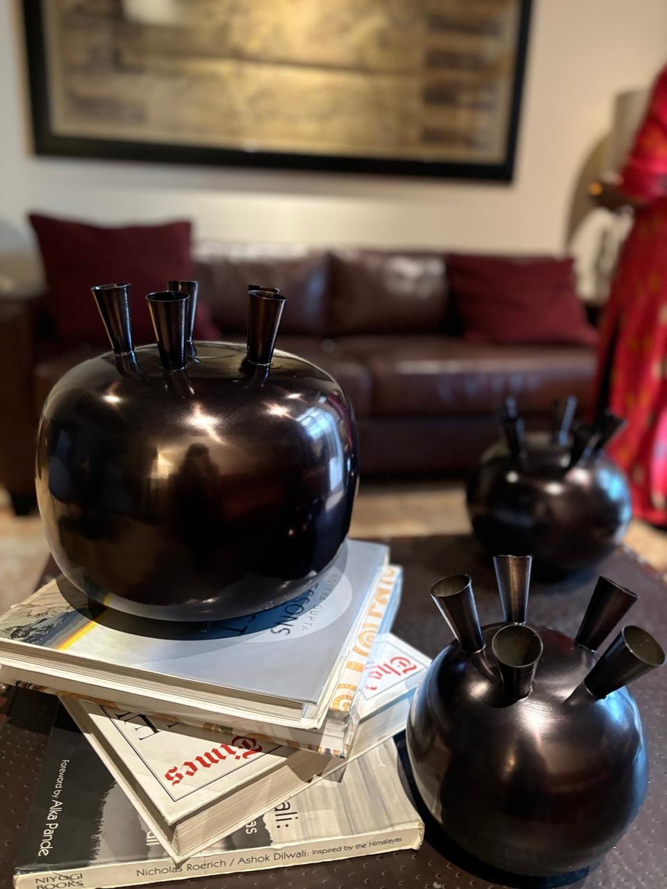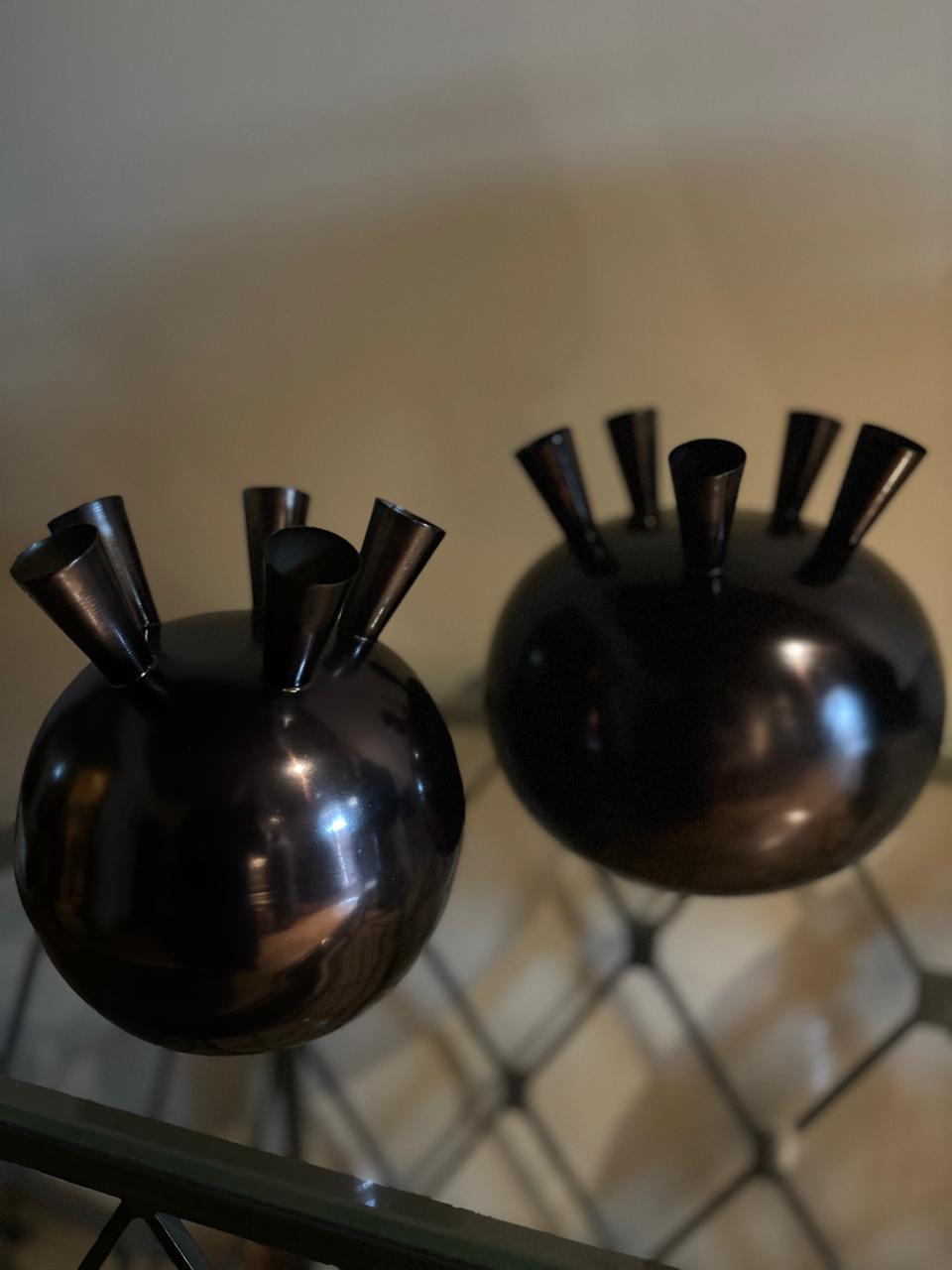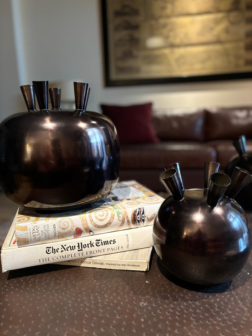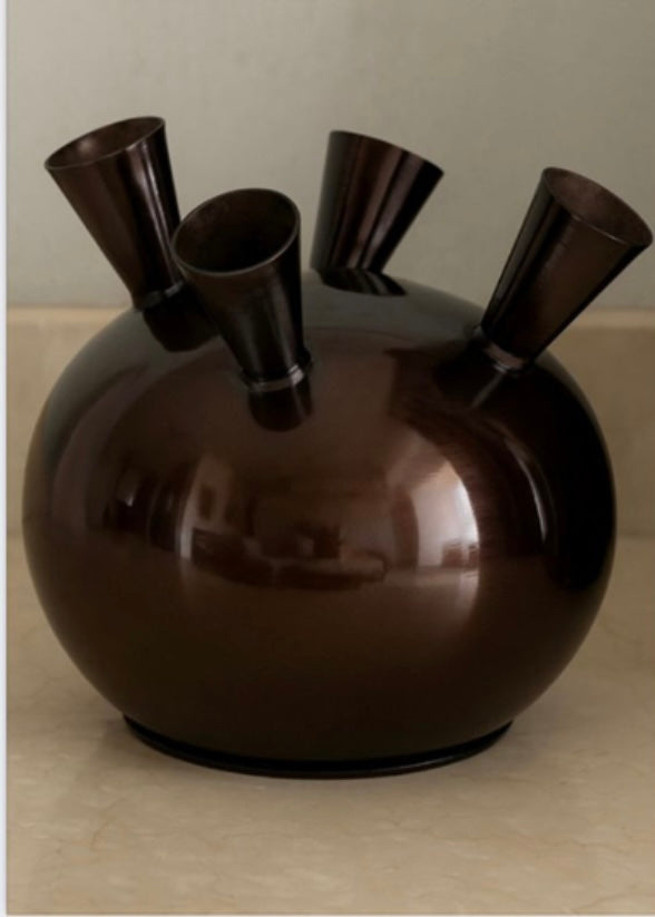 Bold yet refined, the Anara pot is a study in contemporary form and radiant finish. Handcrafted in mild steel with a high-gloss smoked amber surface, its rounded body is crowned with four sculptural flutes that invite dramatic floral arrangements or stand as art in their own right. The rich, mirror-like surface captures and reflects light, adding depth and warmth to any setting. A statement piece that speaks the language of modern luxury.