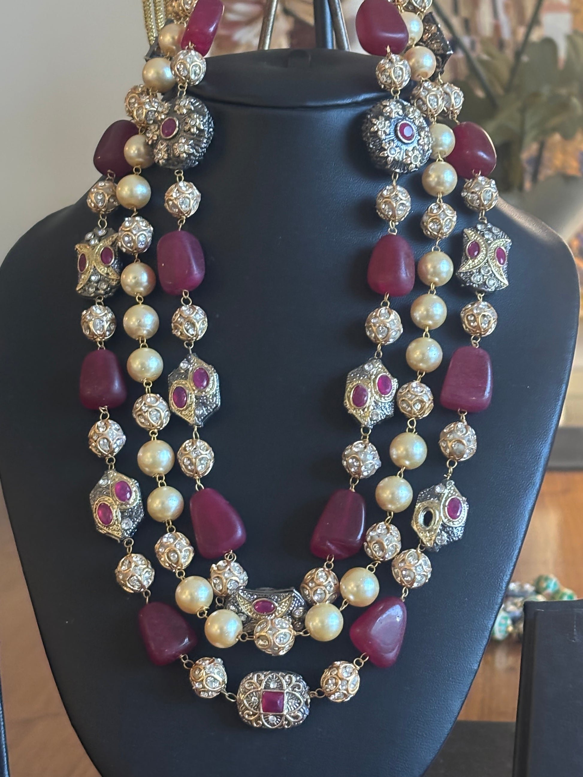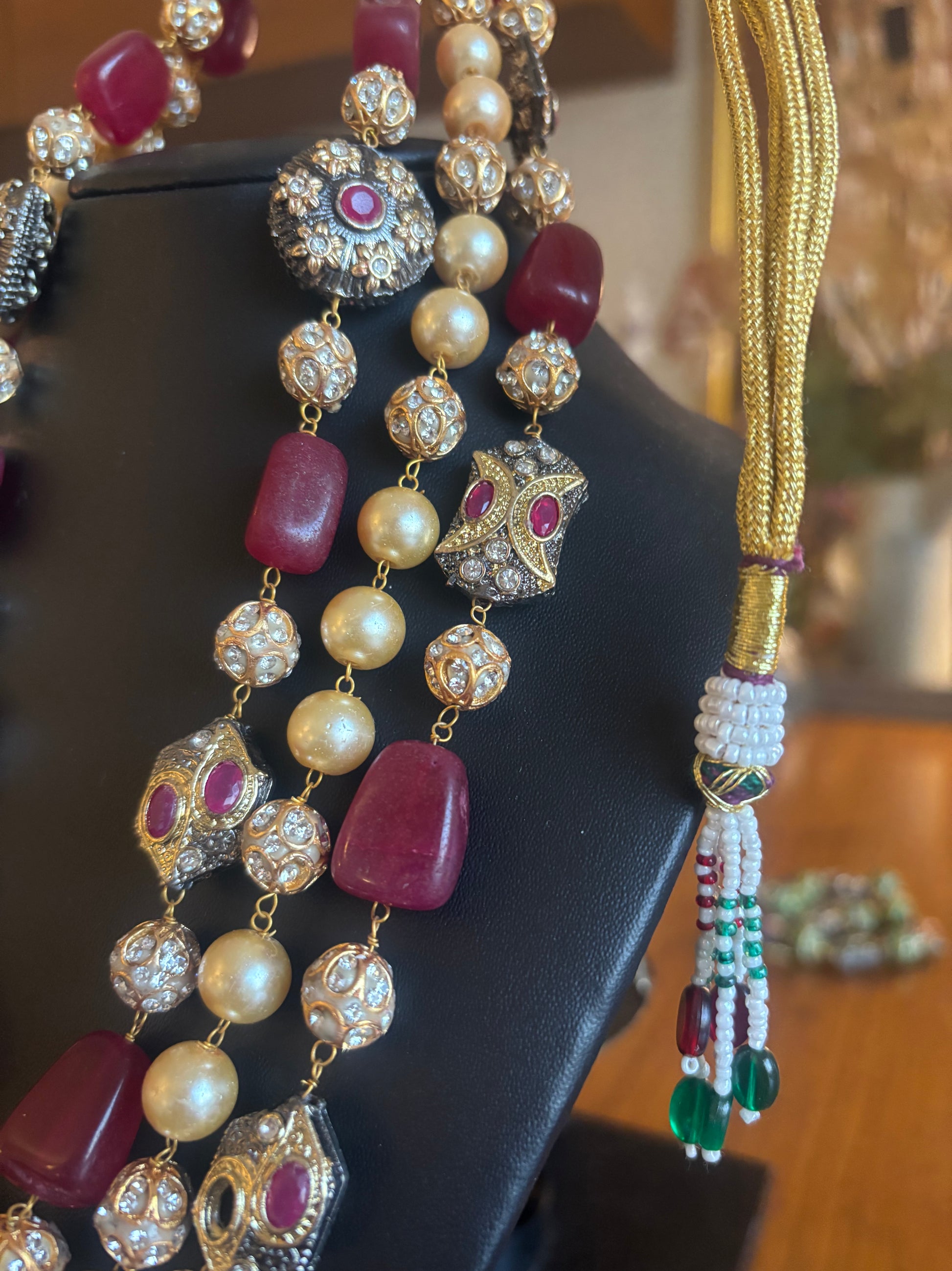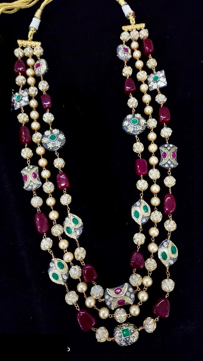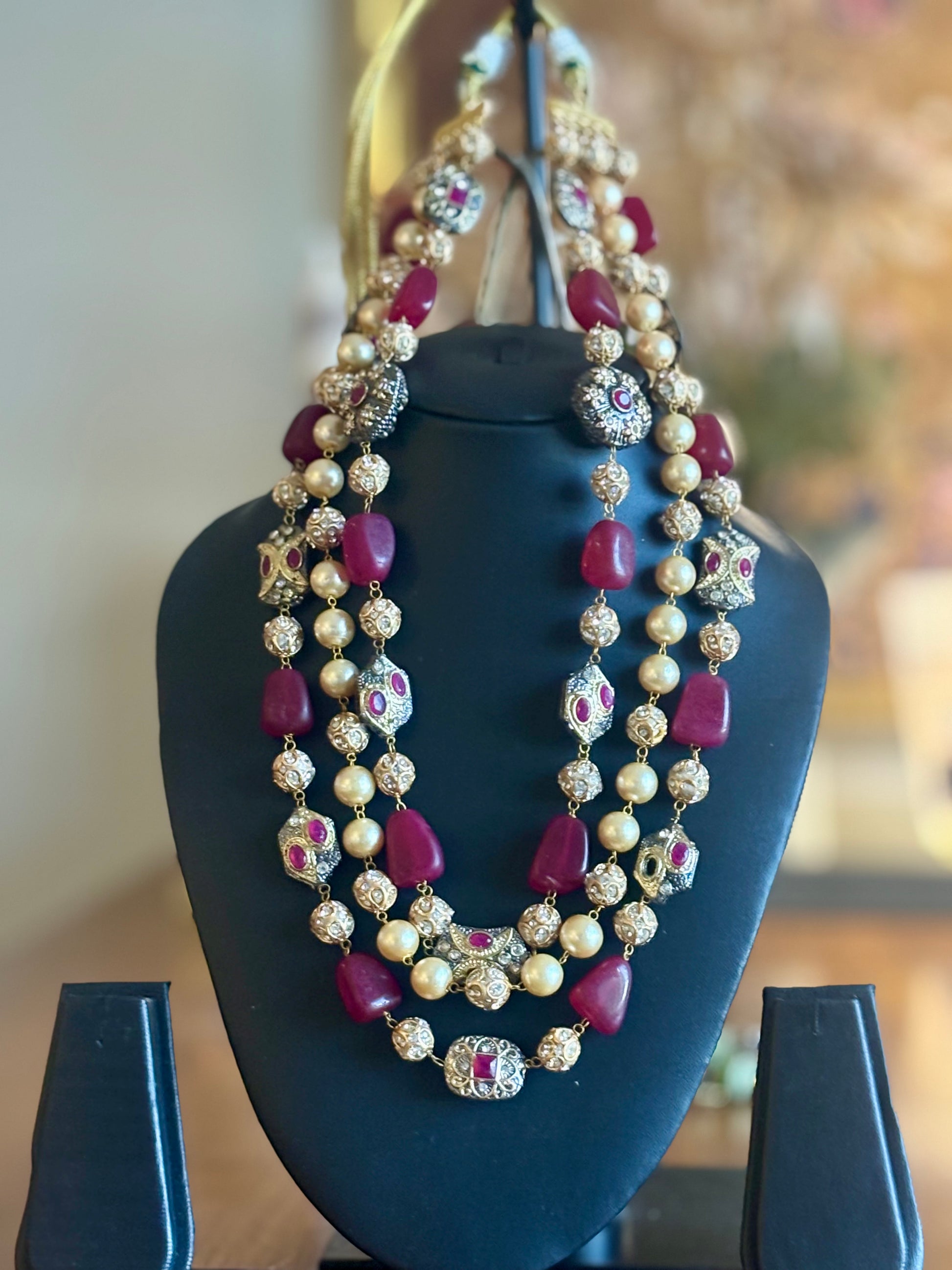 A grand, three-string masterpiece draped in lustrous pearls, deep ruby tumbles and emerald-set kundan accents. The layered construction gives Afsara its signature regal presence—flowing with the grace of a crown and the femininity of heirloom jewelery. Majestic yet modern, it is crafted to command attention with every elegant tier.