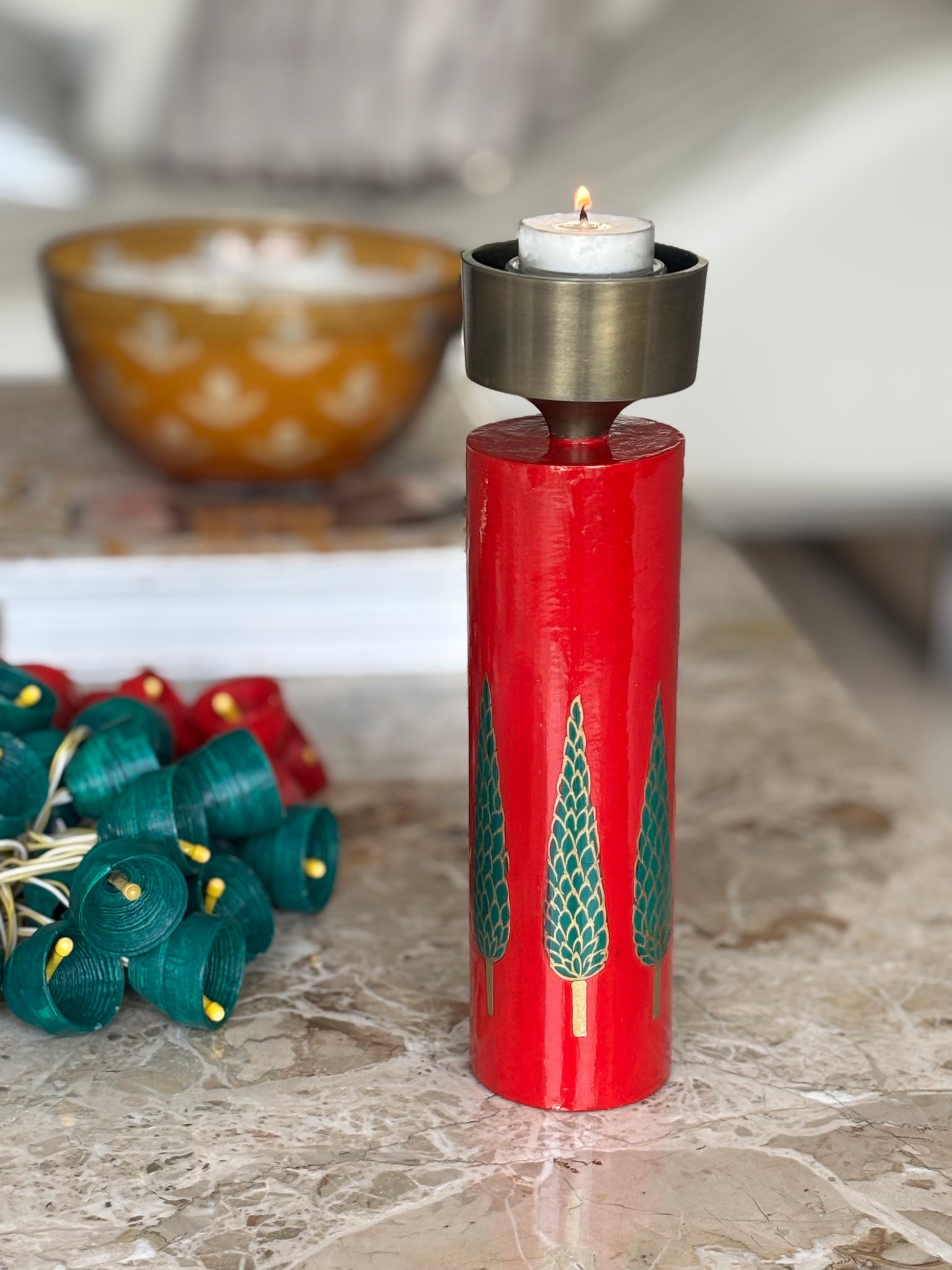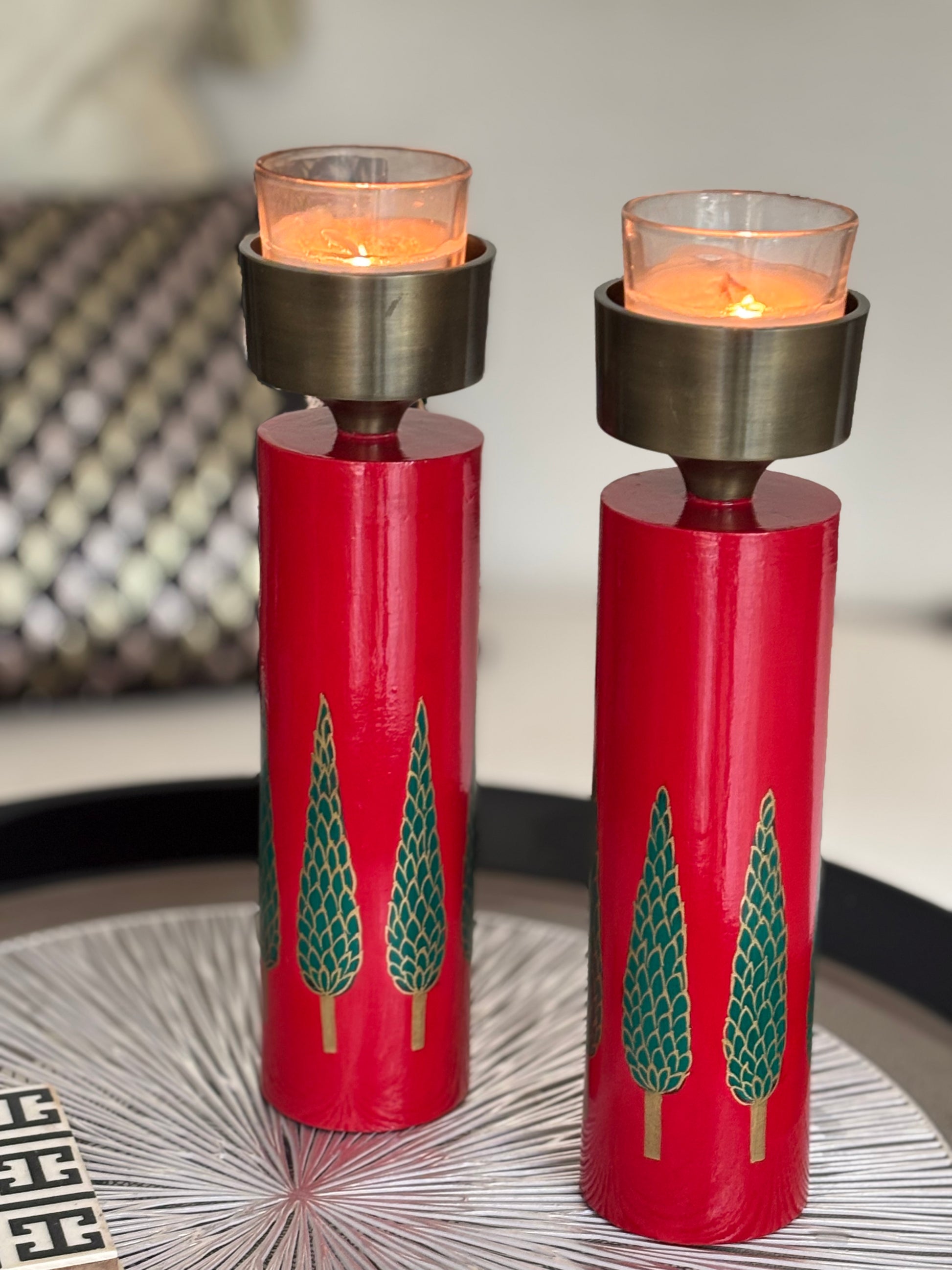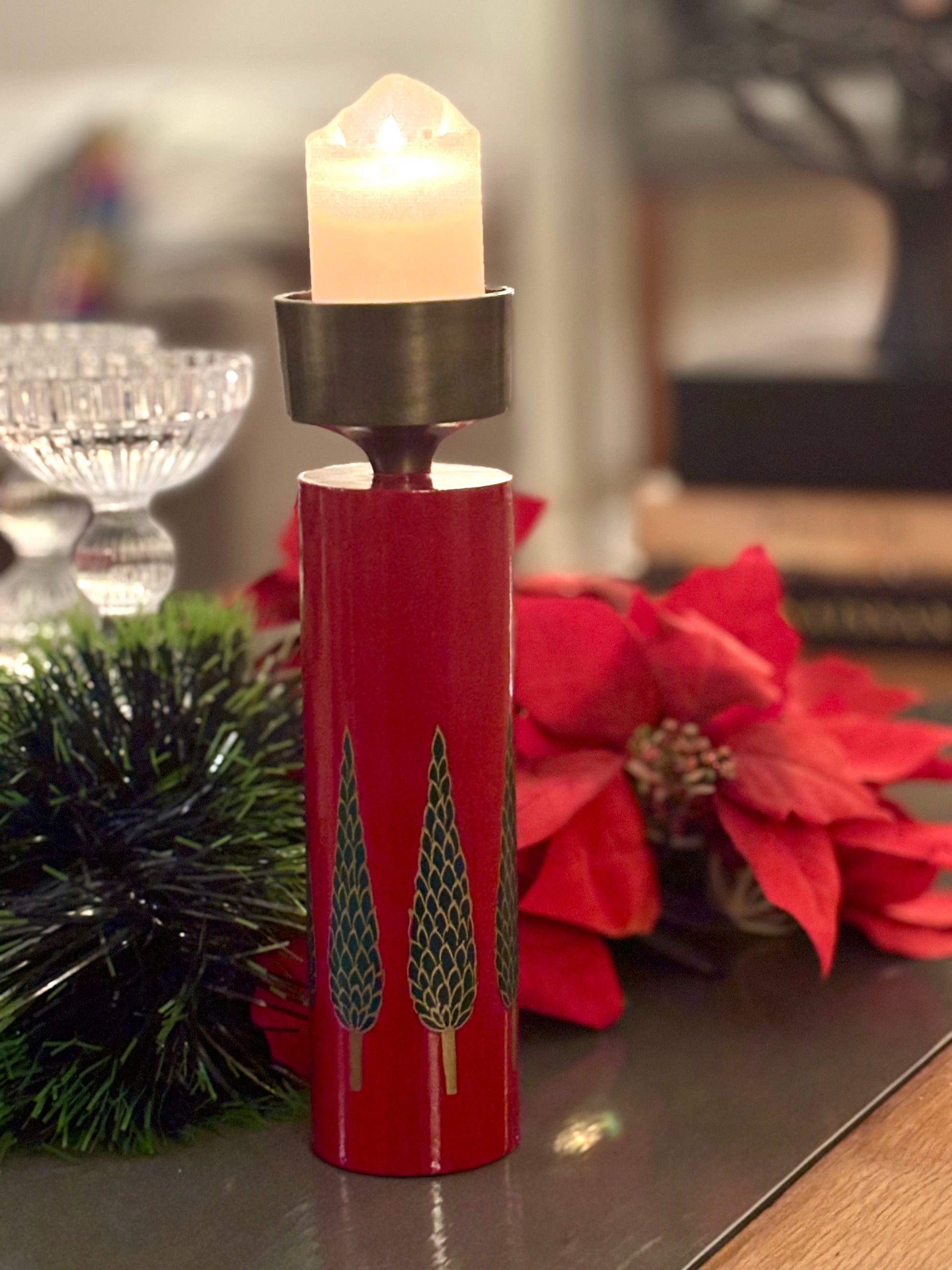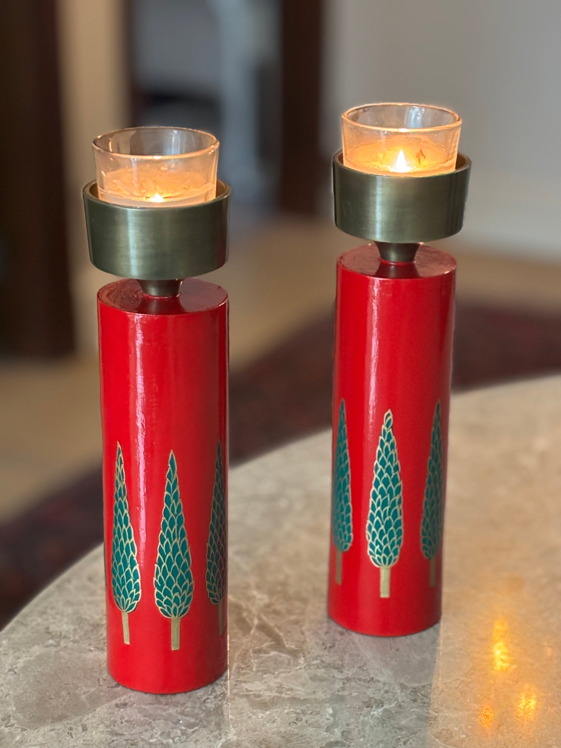 The Crimson Cypress Candle Holder is a striking hand-crafted wooden accent that captures the charm of the festive season. Finished in a rich crimson lacquer, the cylindrical base is adorned with meticulously hand-painted cypress trees that wrap around the piece, creating a serene winter-forest tableau from every angle. The brushed metal candle cup adds a touch of modern elegance, balancing the warmth of wood with a refined metallic sheen.