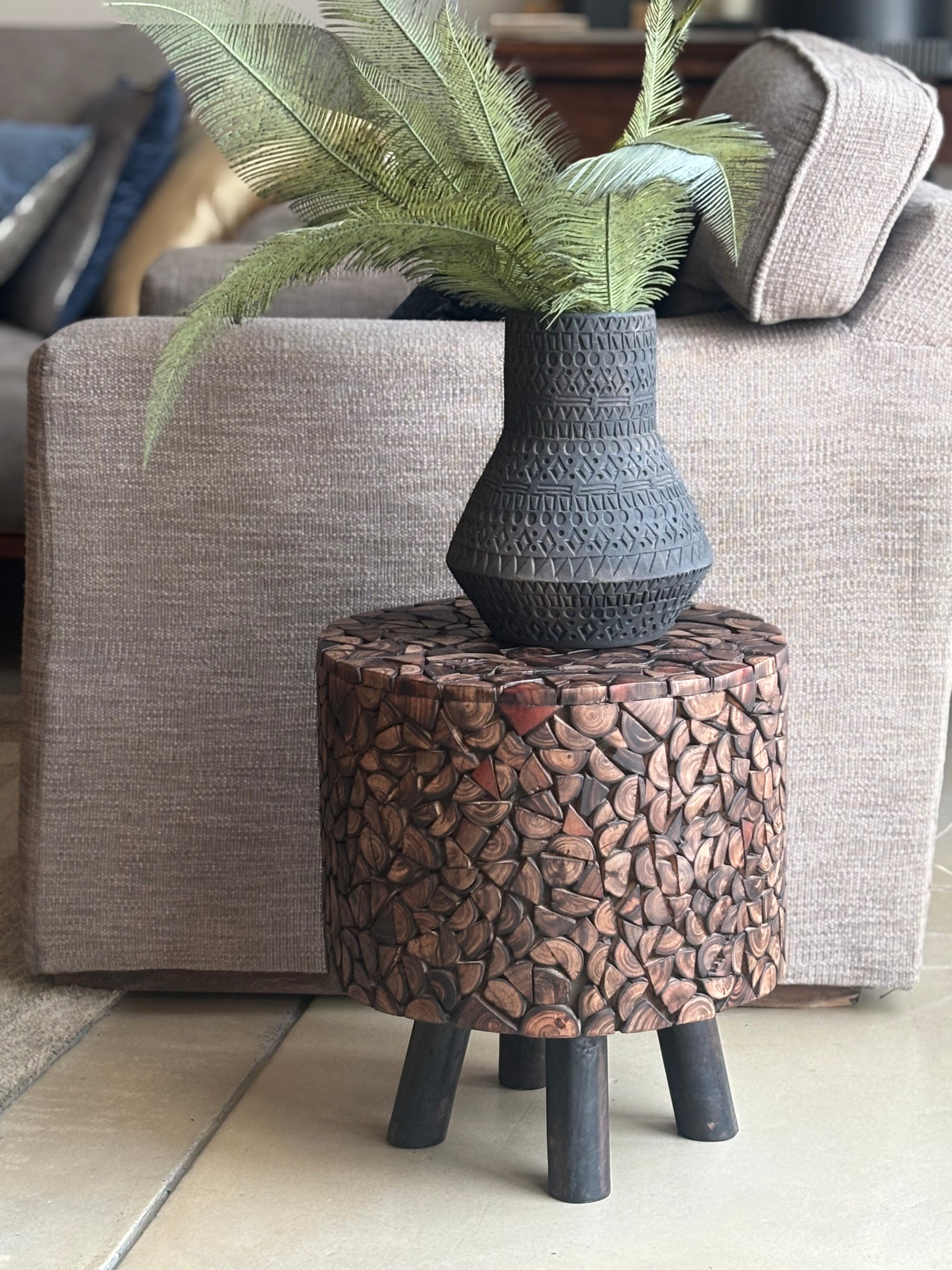 The Ember Mosaic Table is a handcrafted round accent table with a richly textured surface made from end-grain wood slices meticulously arranged in a mosaic pattern. The design showcases the natural grain and variation of the wood, creating a surface that feels both organic and sculptural. Each slice reveals the heart of the tree—its rings, its rhythm, its story. The form is simple, the surface alive with detail. Perfect beside a chair, or standing alone as sculpture.