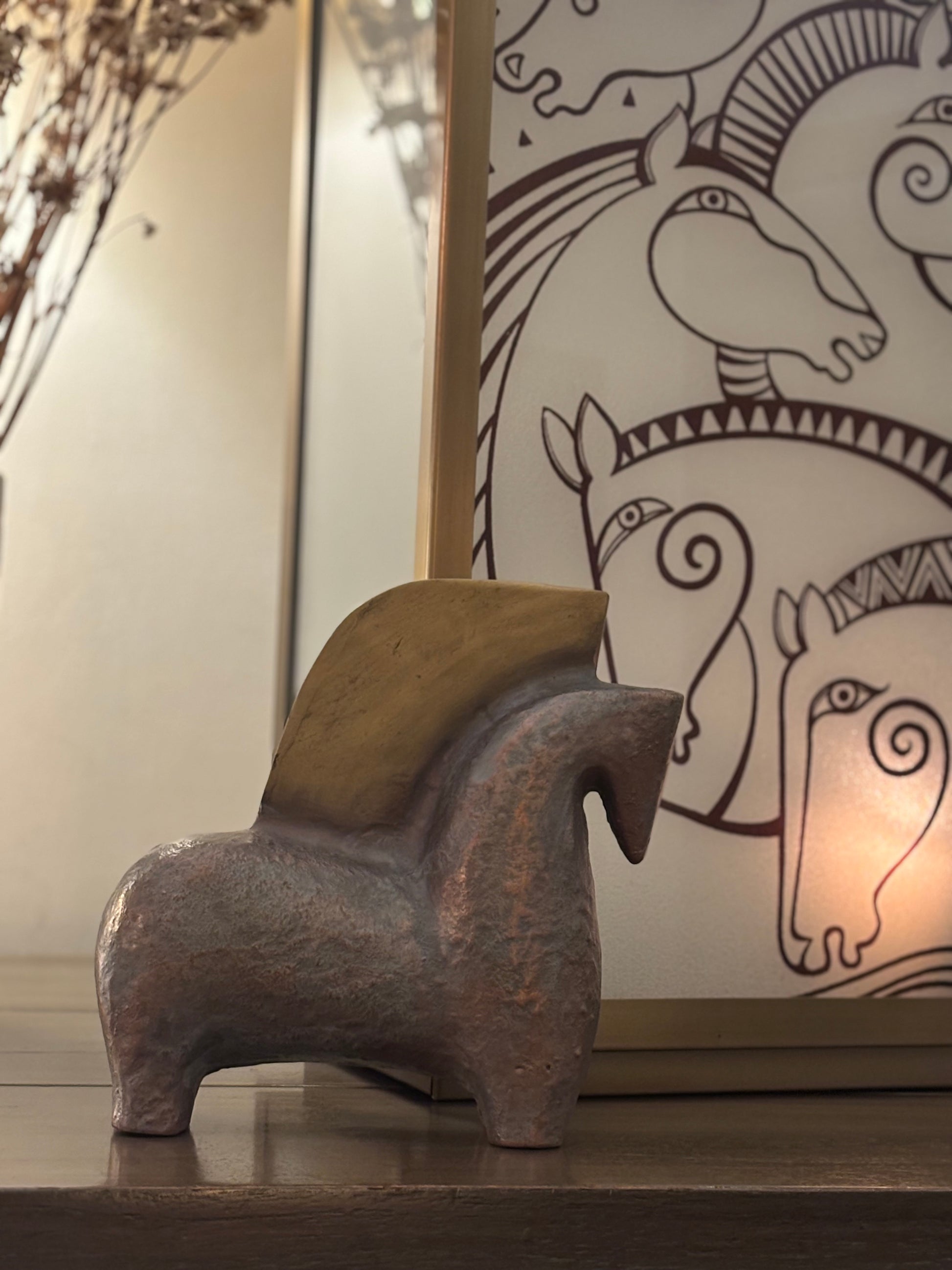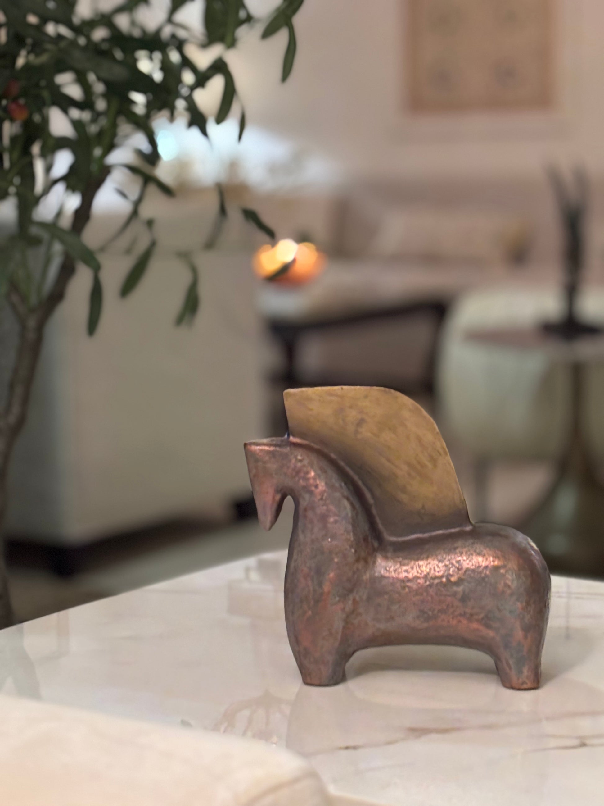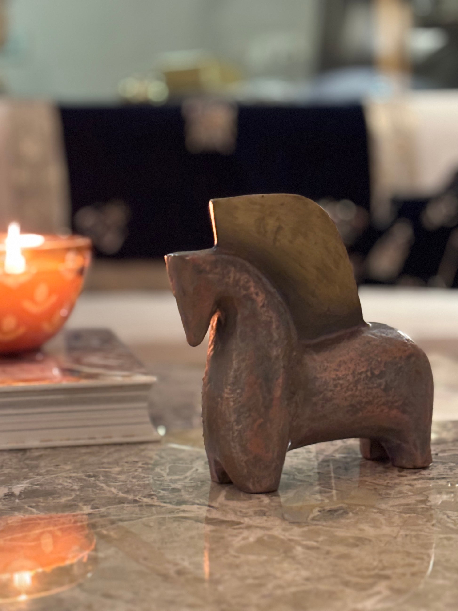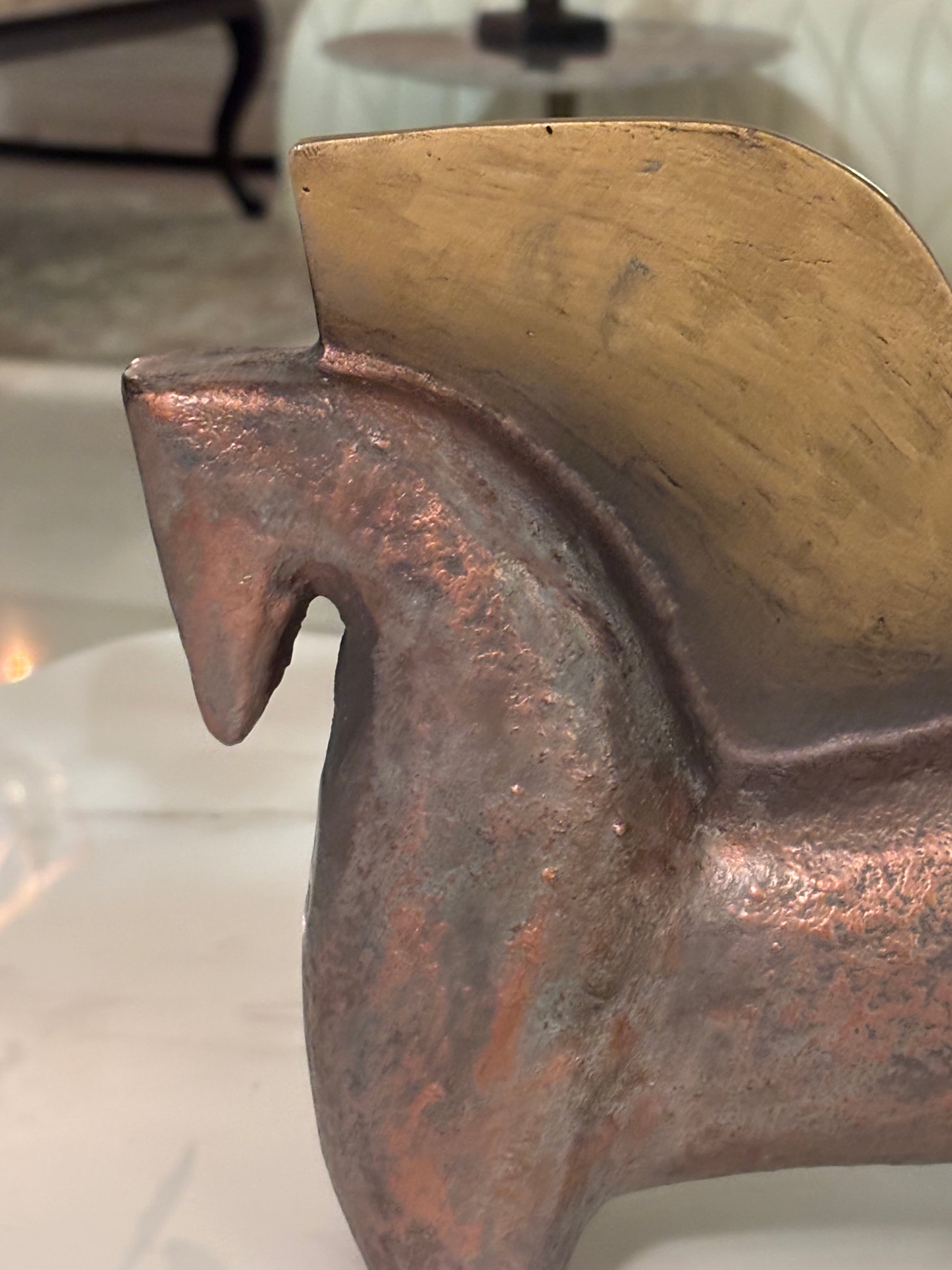 A patinated heavy bronze sculpture with a minimal yet authentic presence. The body is created in a metallic reflection with a majestic mane suggesting movement and stillness, strength and victory.
