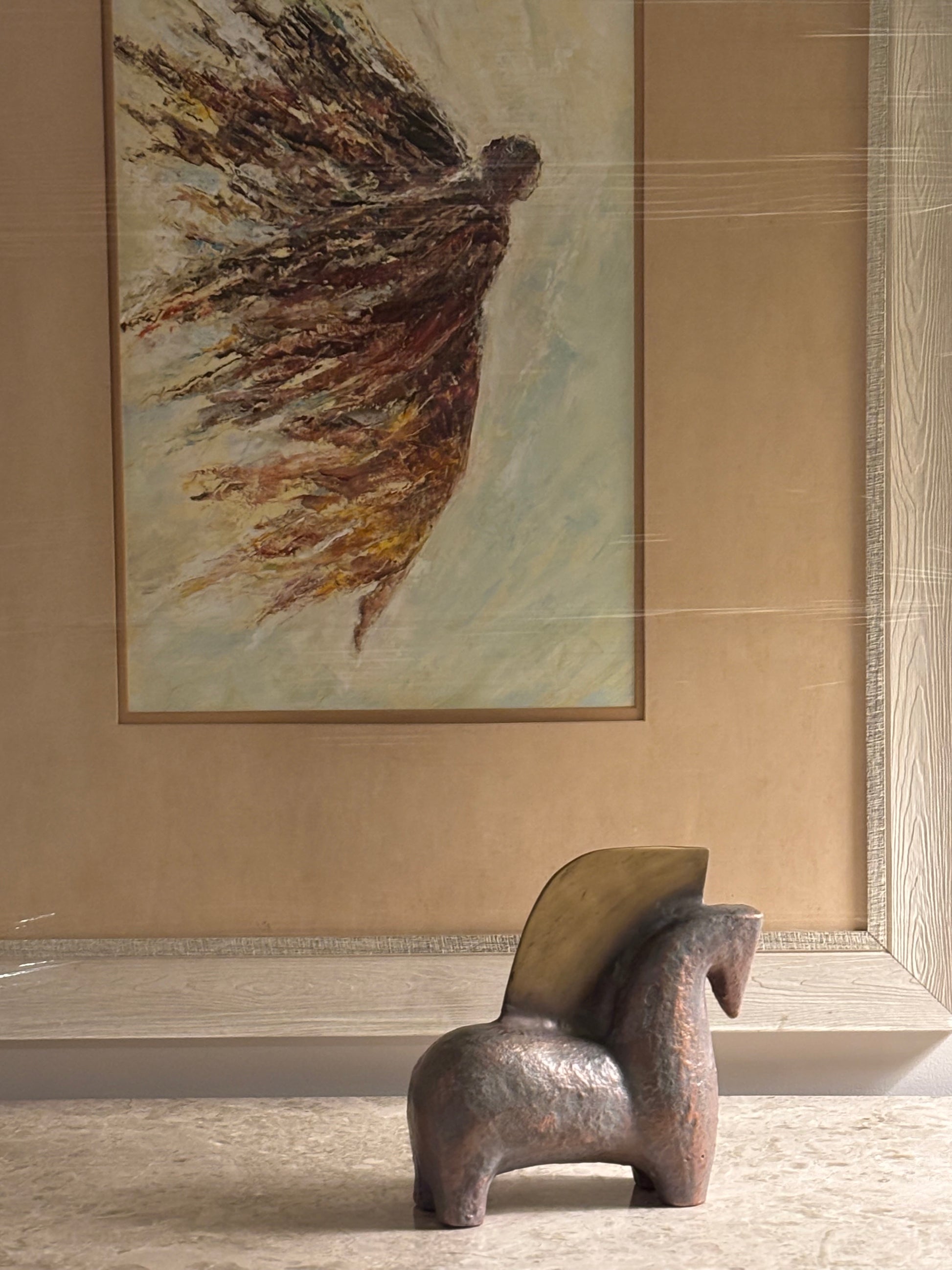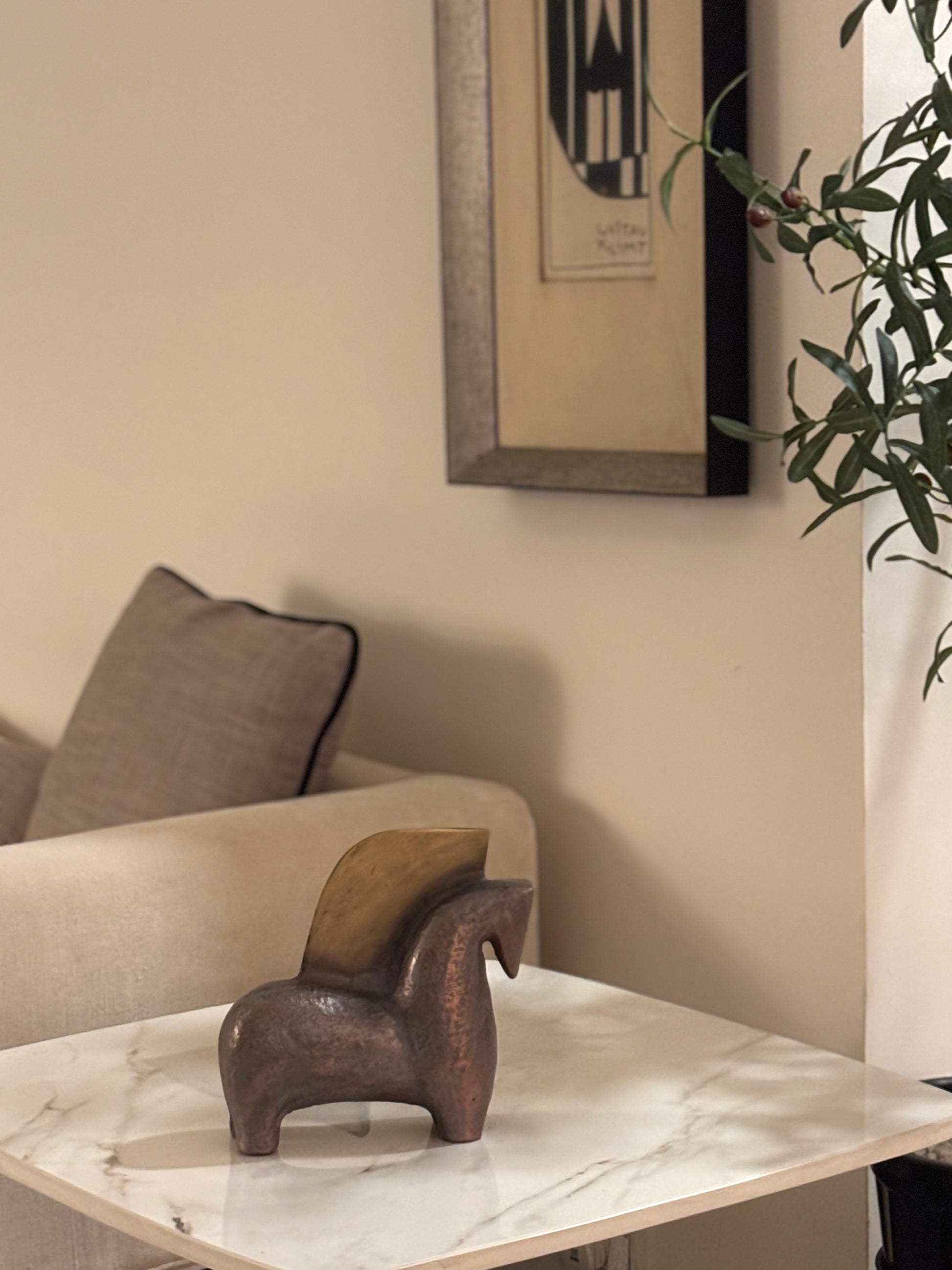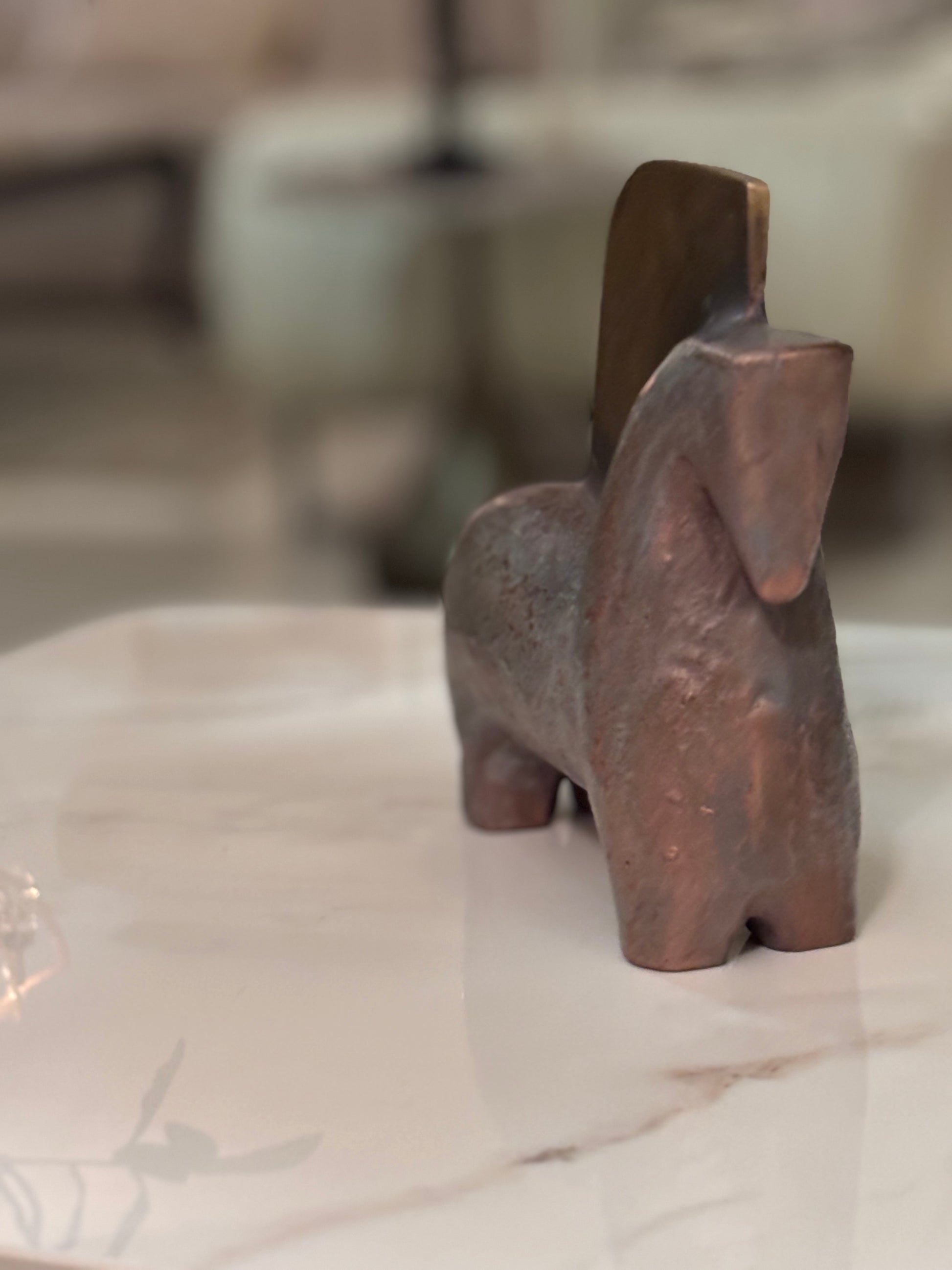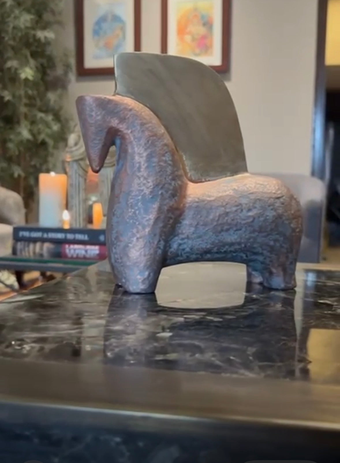 A patinated heavy bronze sculpture with a minimal yet authentic presence. The body is created in a metallic reflection with a majestic mane suggesting movement and stillness, strength and victory.