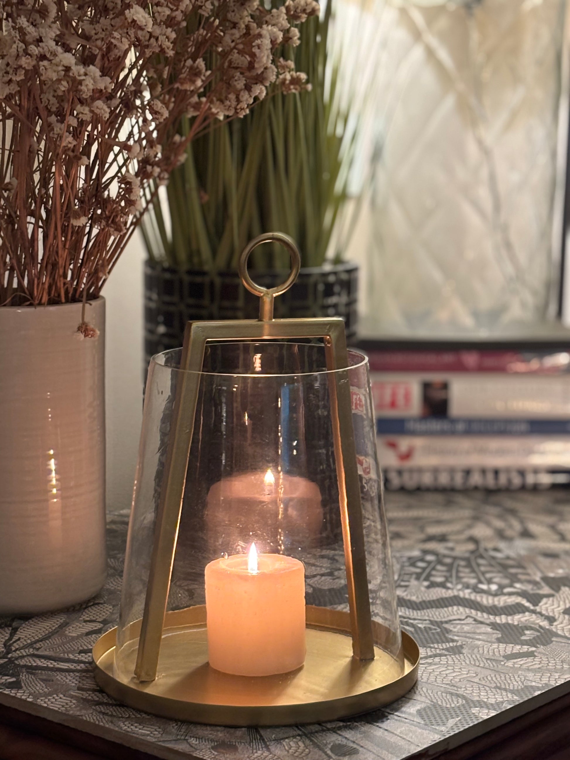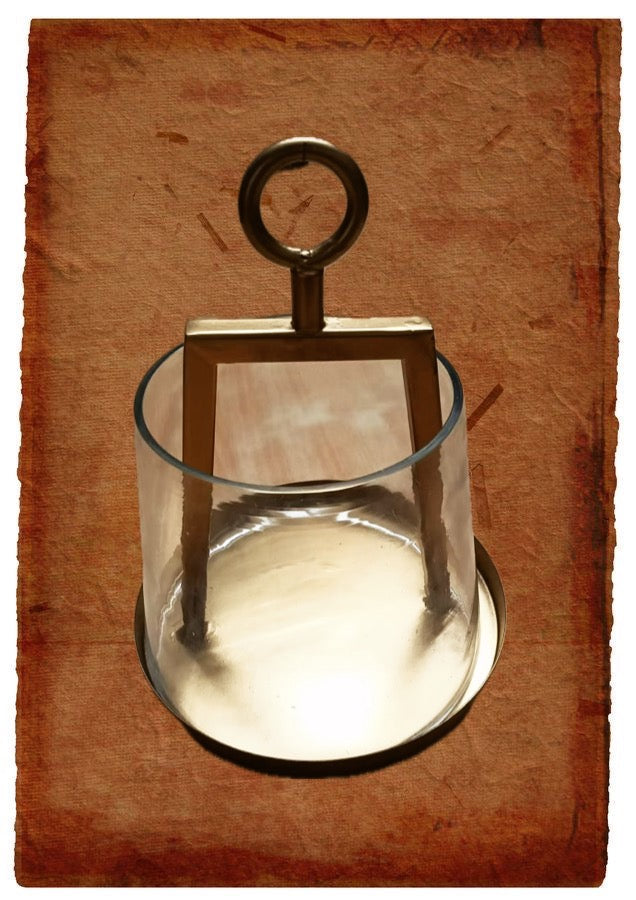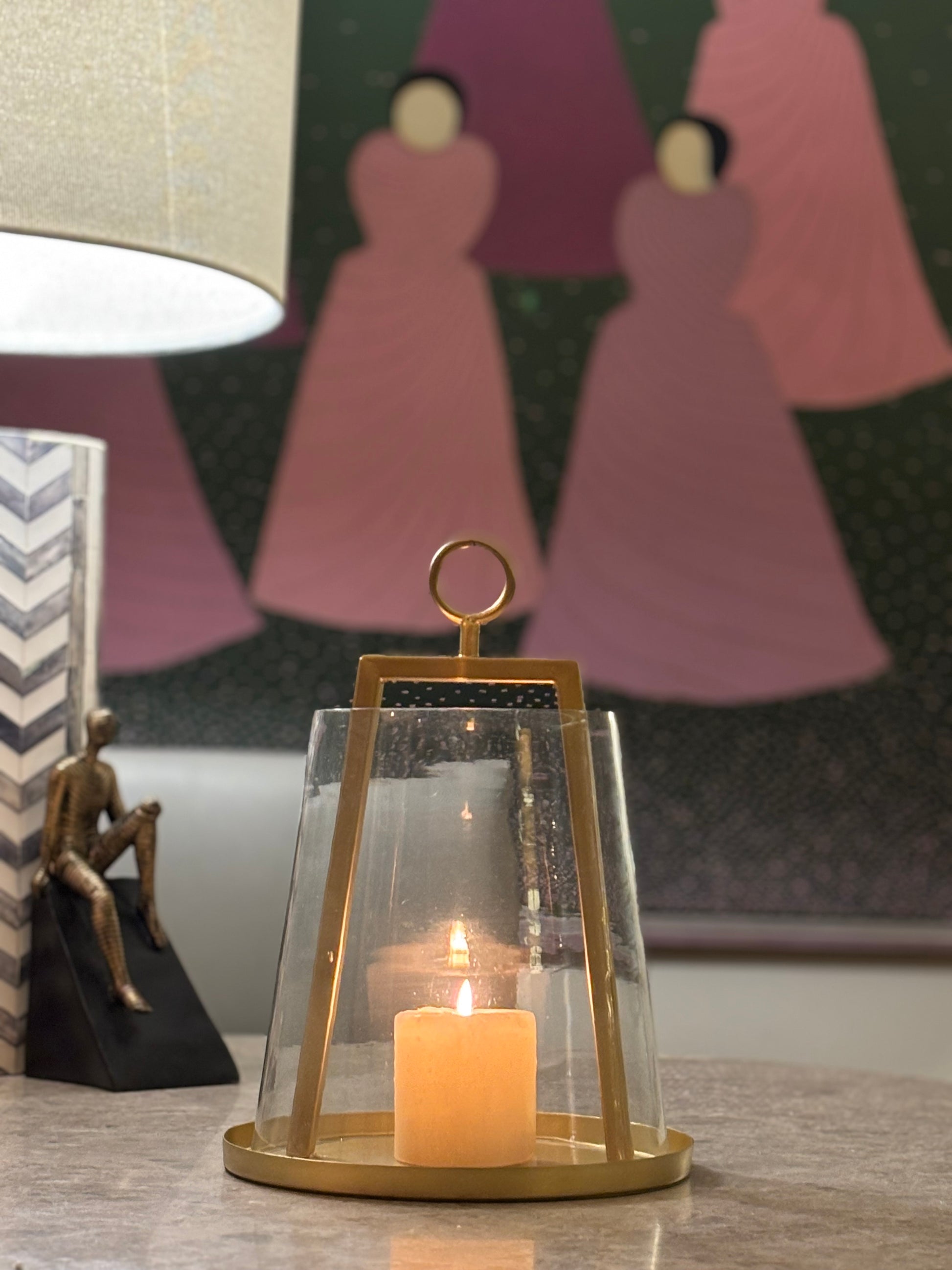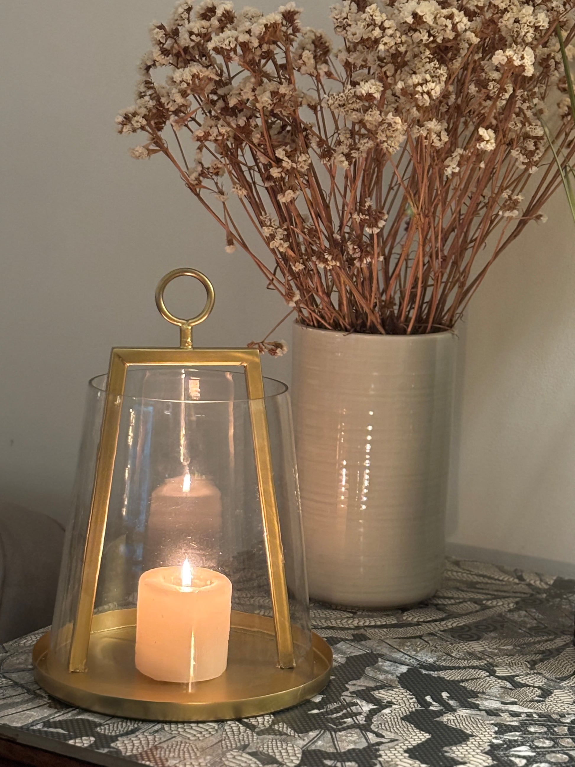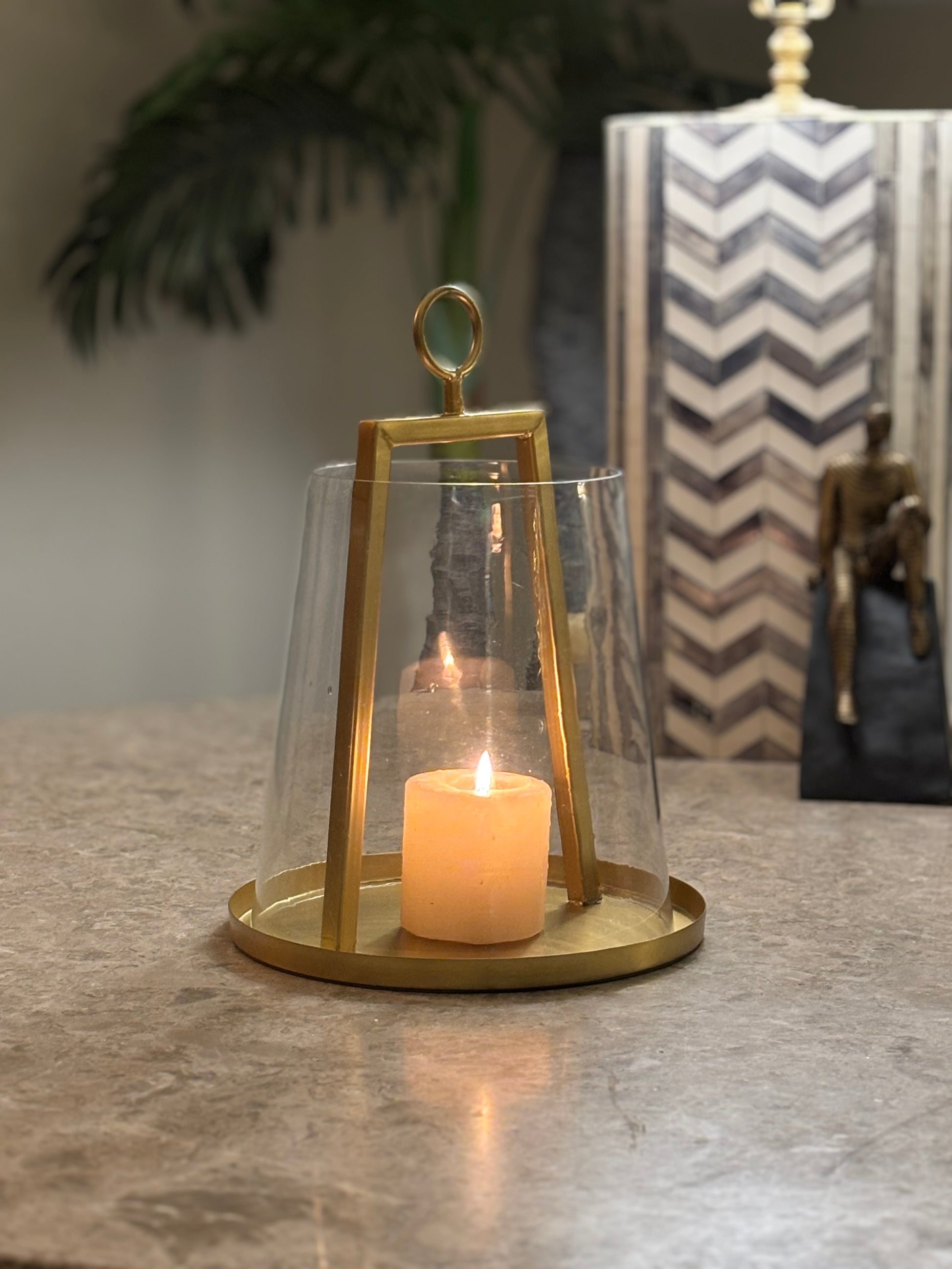 An exquisite conical lantern in brushed brass and glass, its form tapering gracefully to a sculptural ring finial. The circular base amplifies the candle’s golden radiance, casting a soft, opulent glow