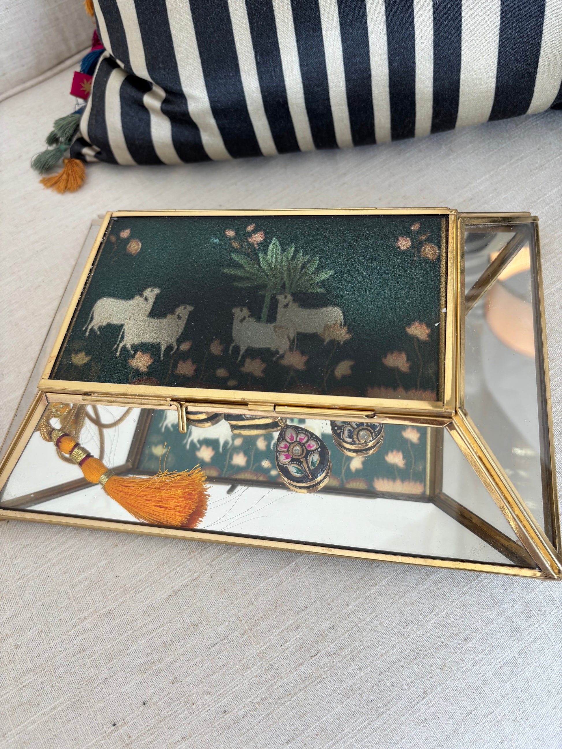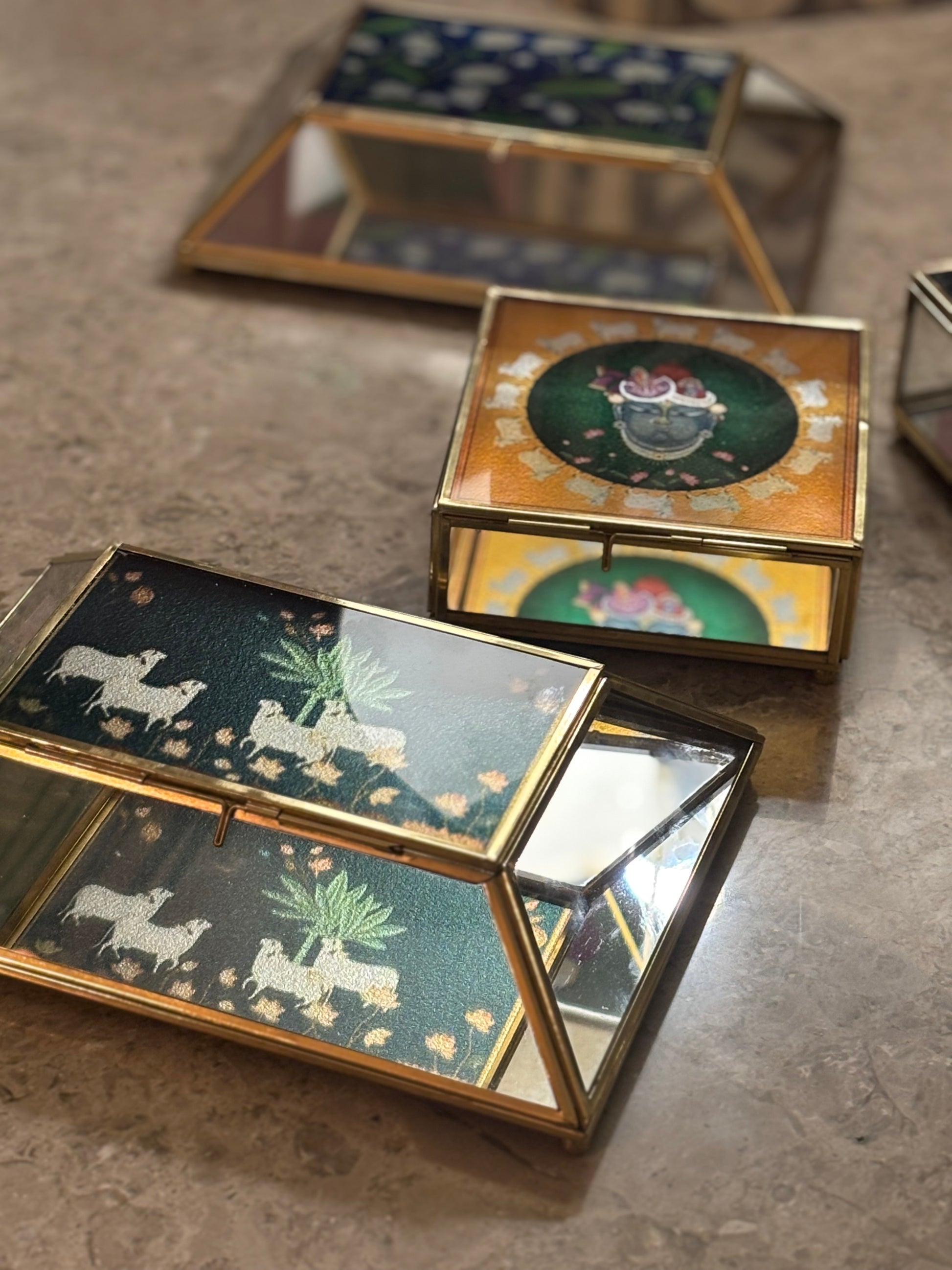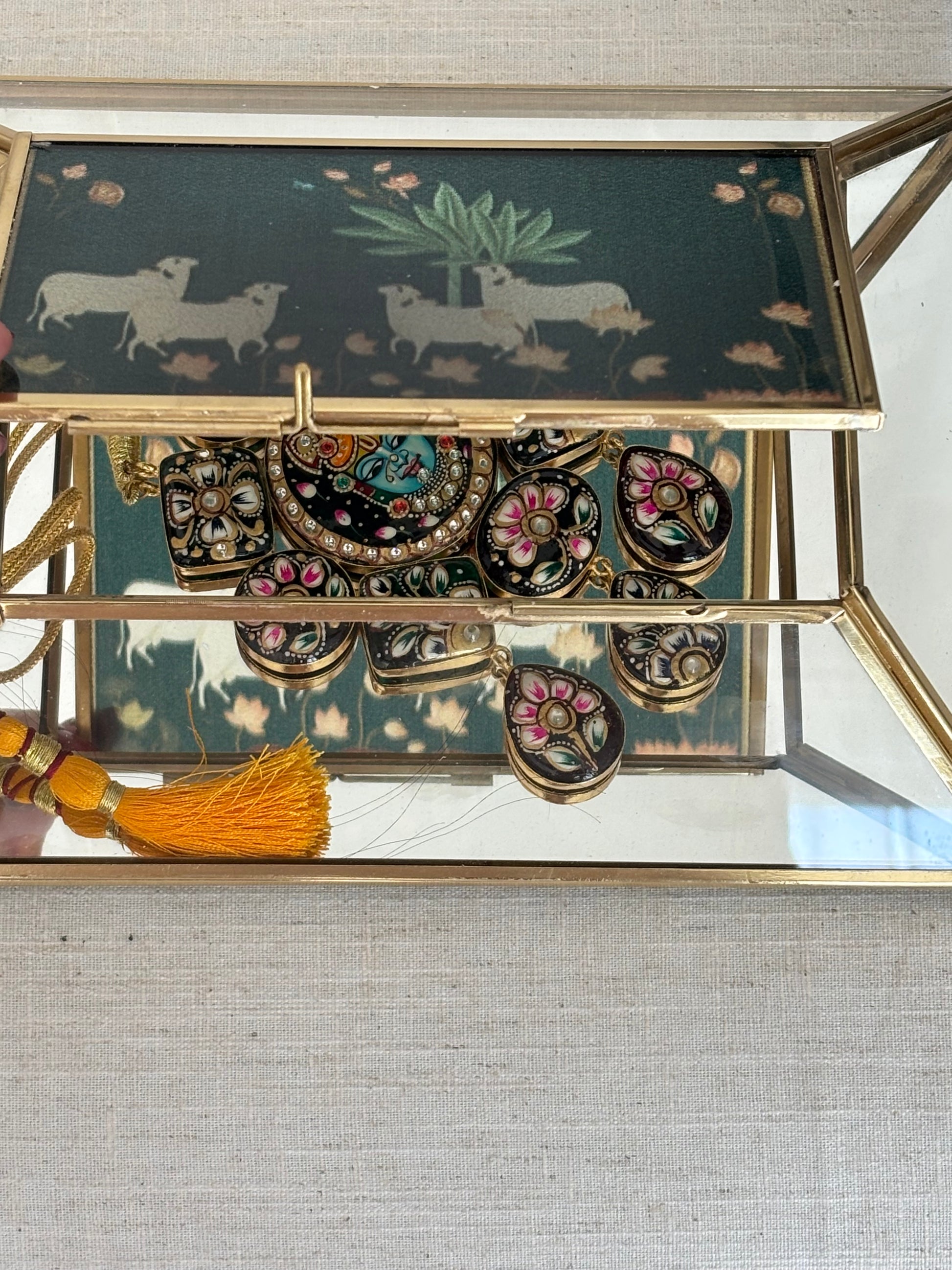 Adorned with sacred cow motifs amid lotus ponds and pastoral settings, this glass boxes echo the quiet grace of Pichwai art. The mirrored interiors magnify each detail, creating a luminous play of reflection and depth. Framed in golden edges, they serve as elegant sanctuaries for treasured keepsakes, balancing functionality with divine artistry.