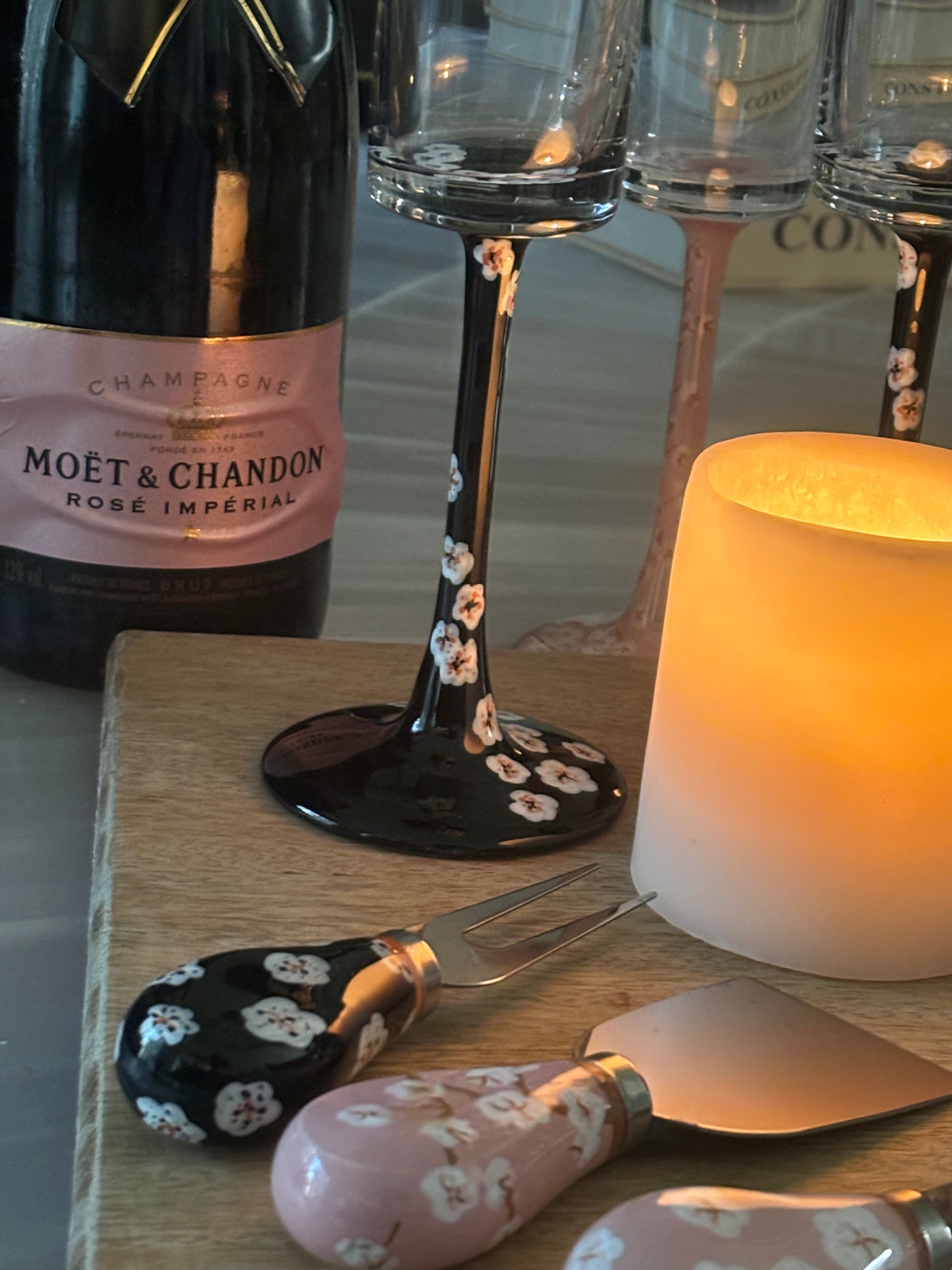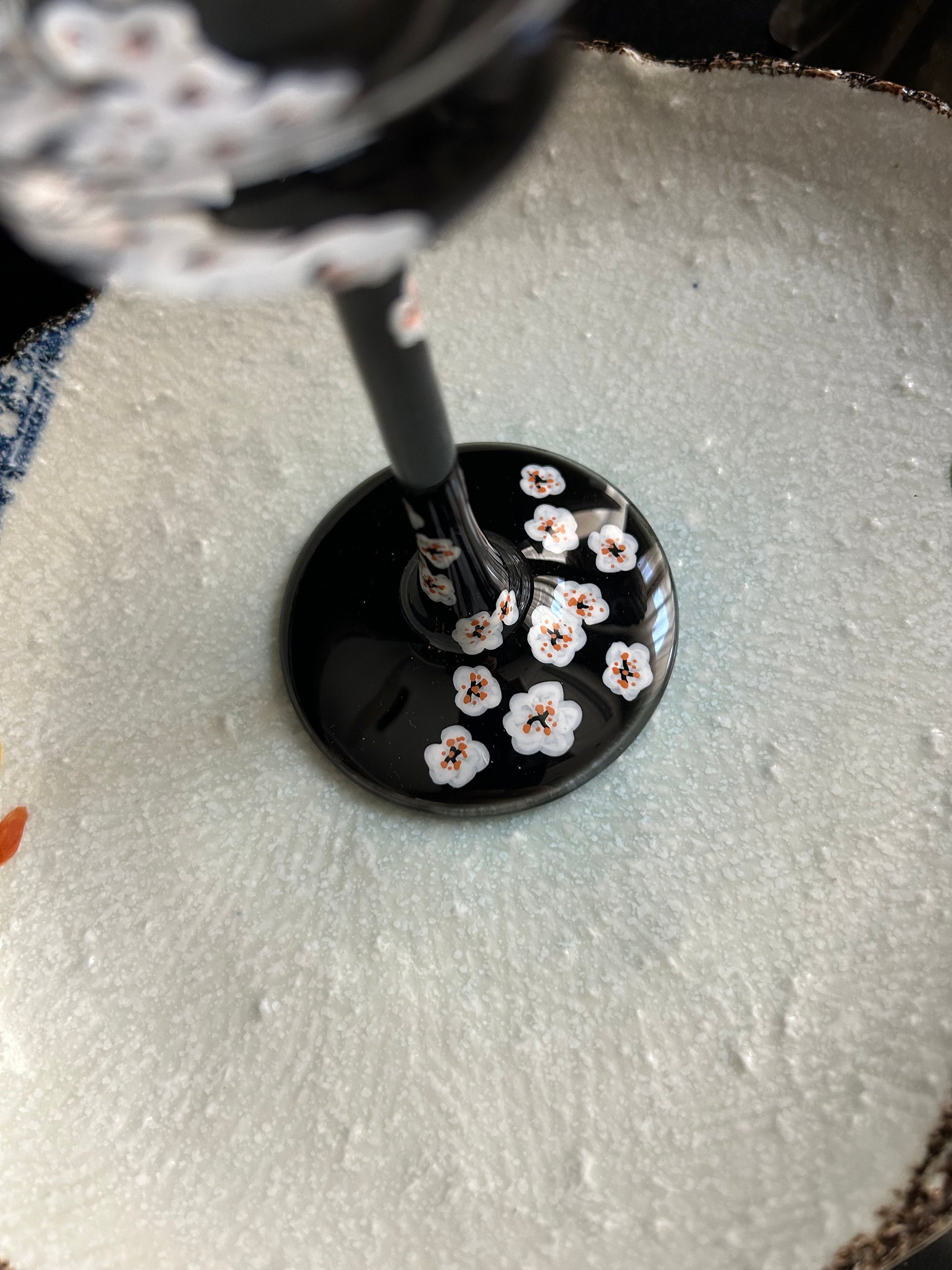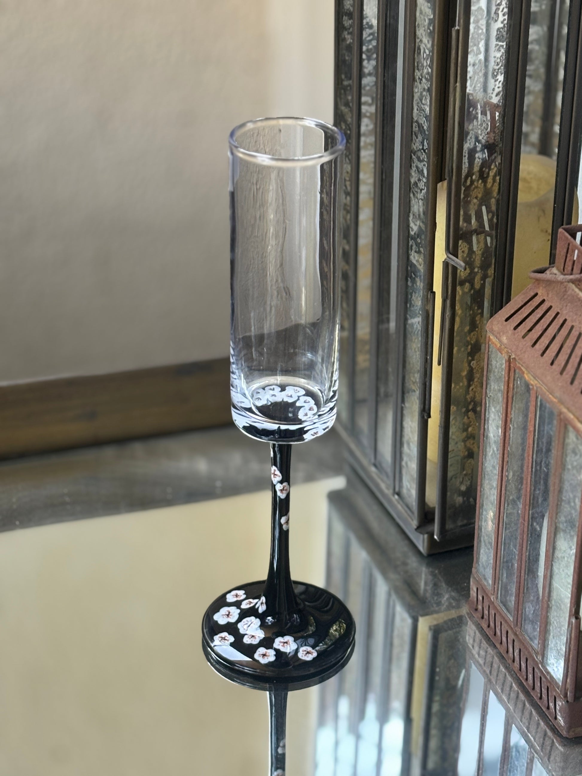 This unique pair of simple zen shaped flutes have been hand painted by the artist with delicate white cherry blossom flowers cascading down from a black stem of the glass to its base. These iconic flowers can be seen from inside the glass, and enjoyed with every sip!