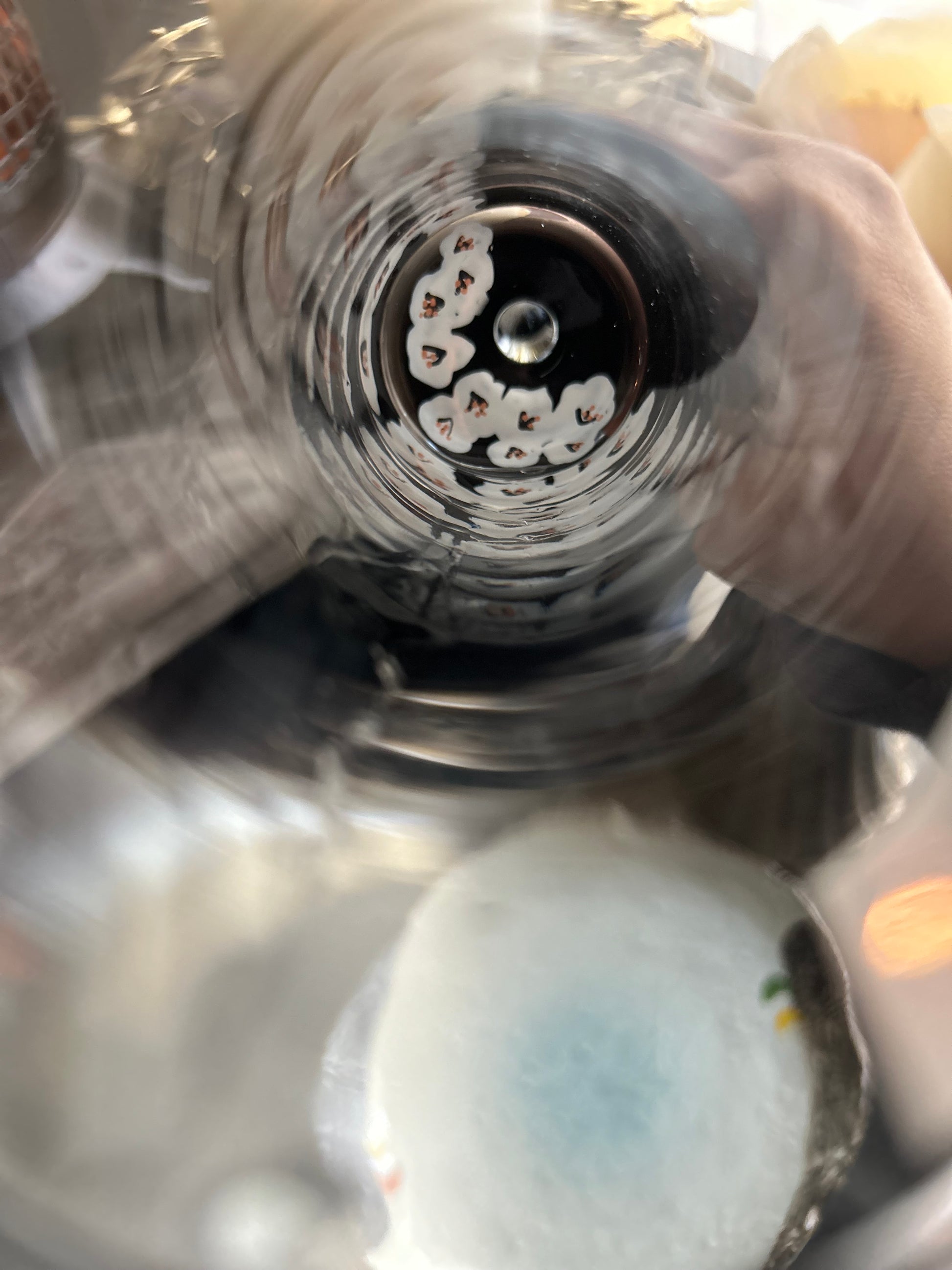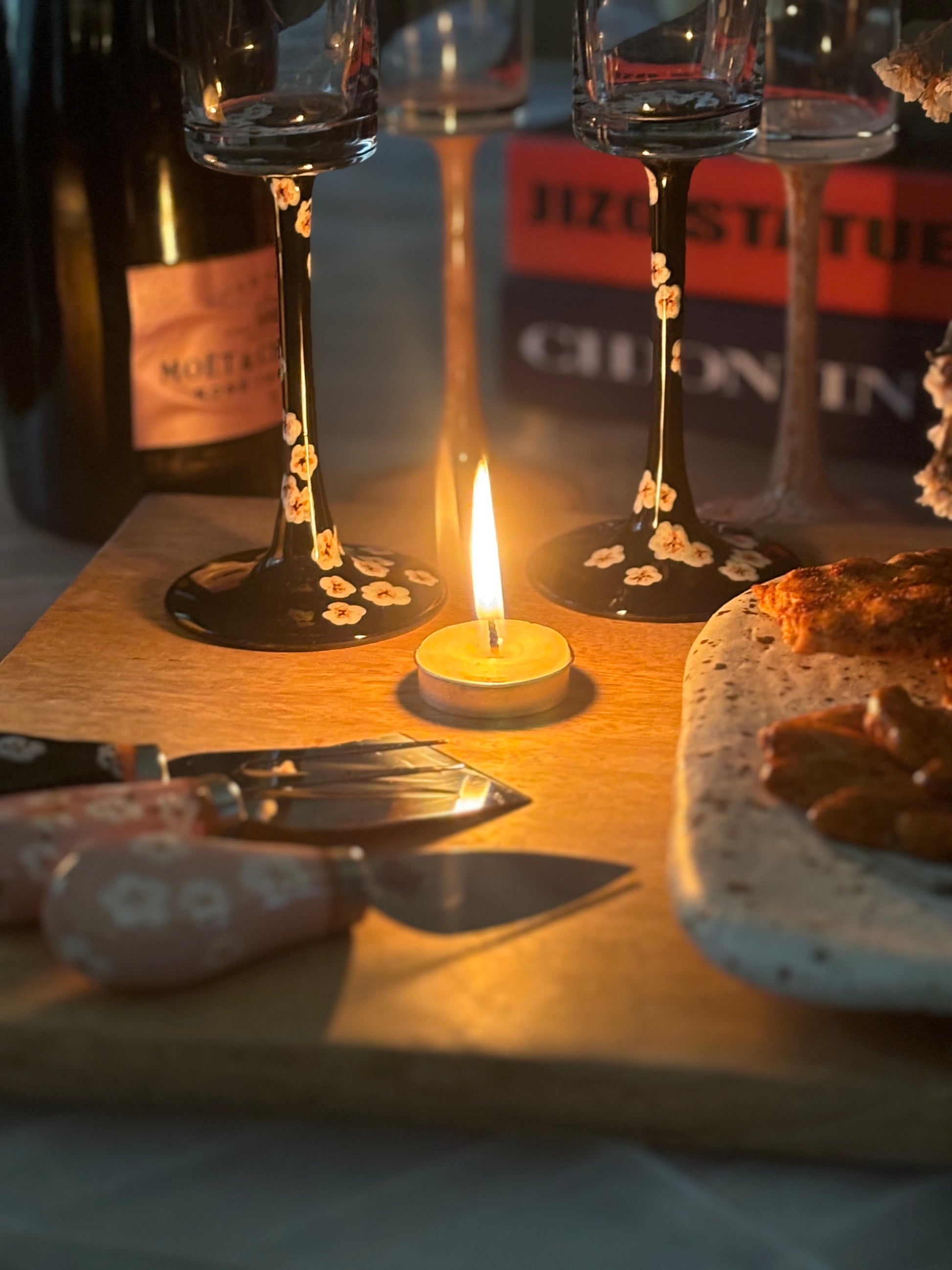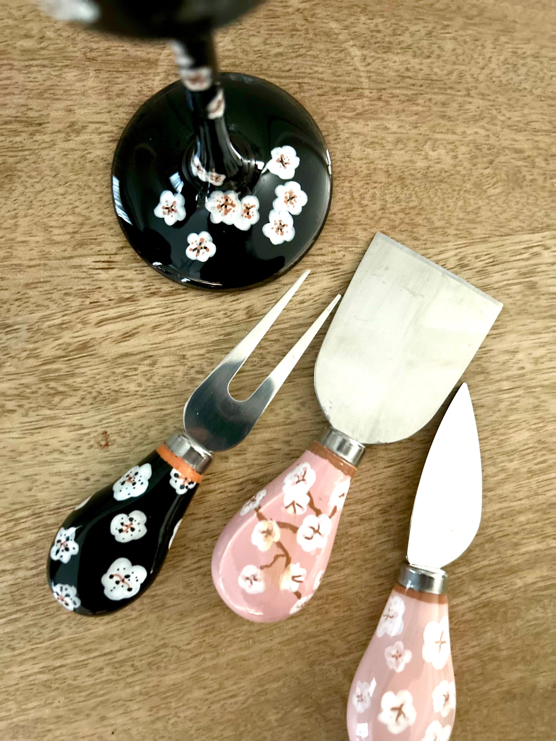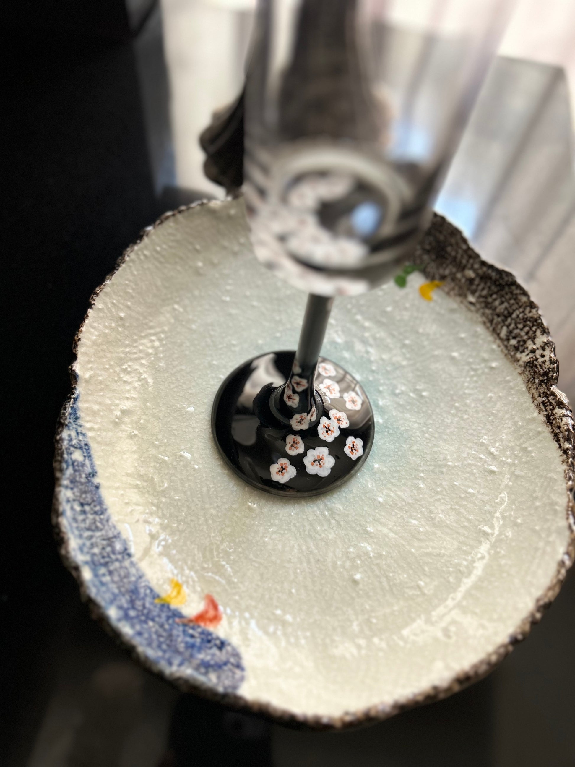 This unique pair of simple zen shaped flutes have been hand painted by the artist with delicate white cherry blossom flowers cascading down from a black stem of the glass to its base. These iconic flowers can be seen from inside the glass, and enjoyed with every sip!