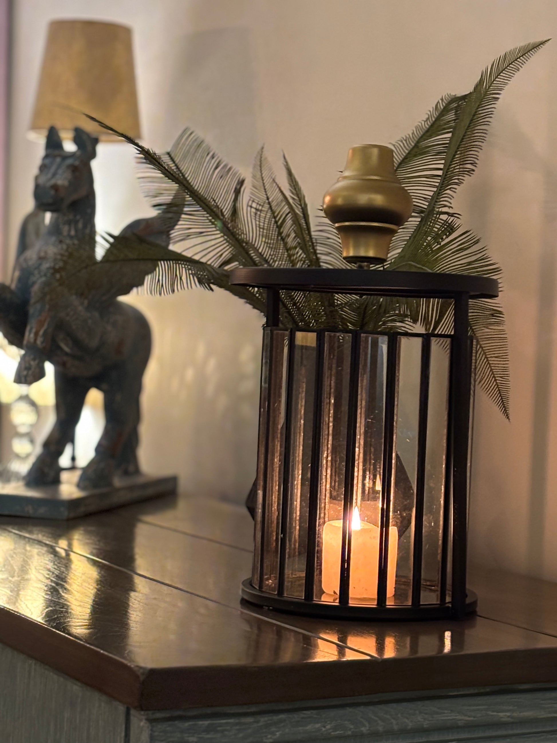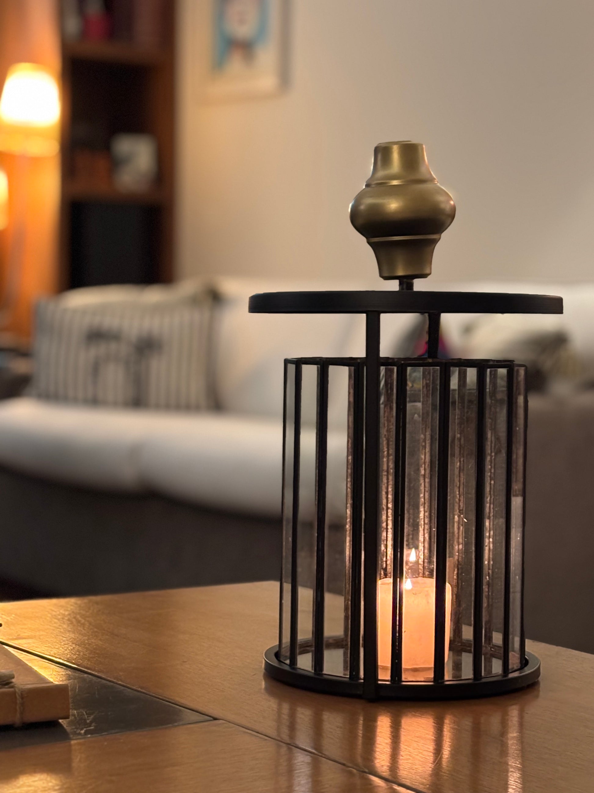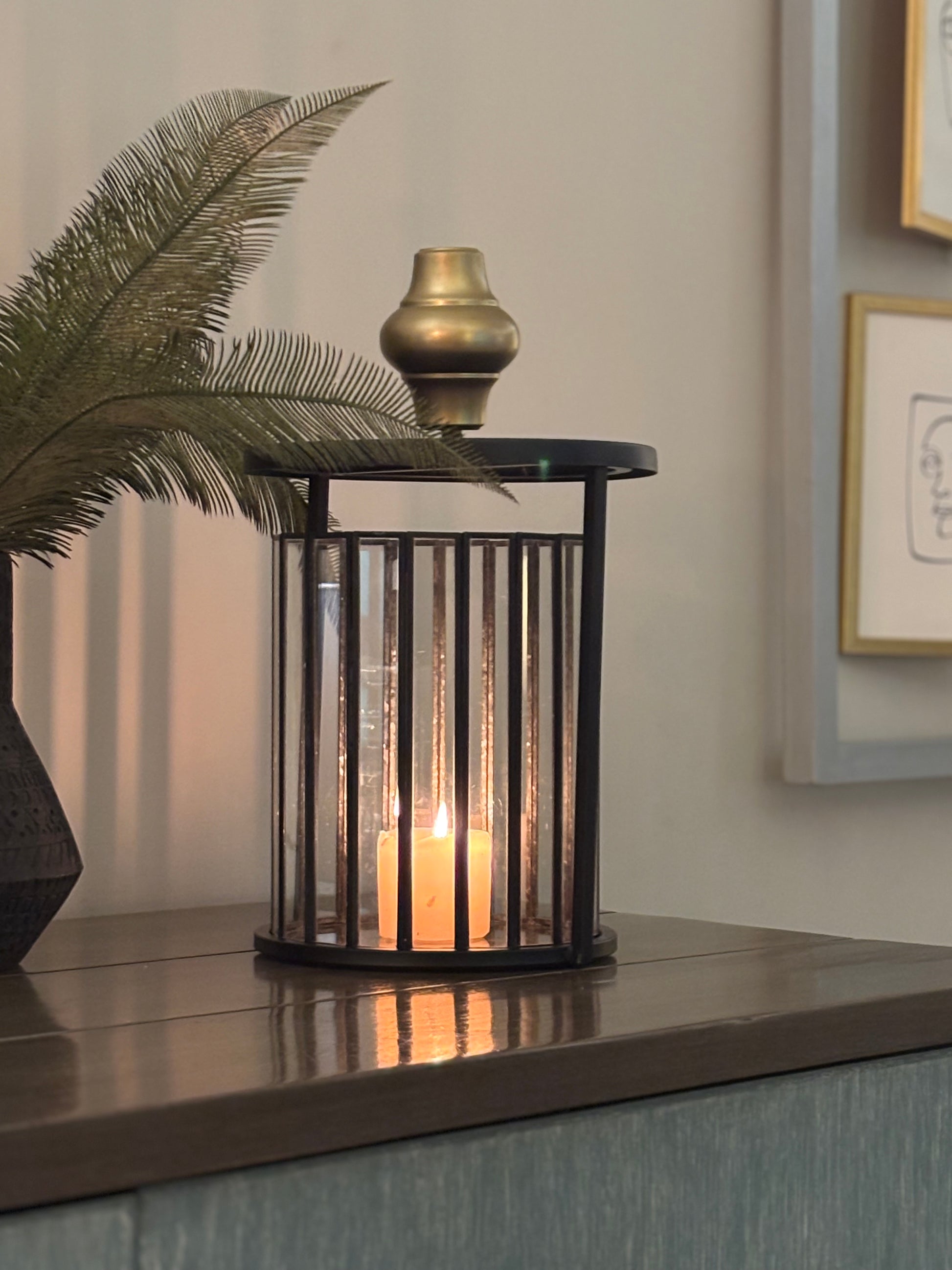 Made to house a pillar candle or stand alone as sculptural decor with vertical bars that add texture and dimensions. Rich and stylish to place on side tables, consoles and festive displays.