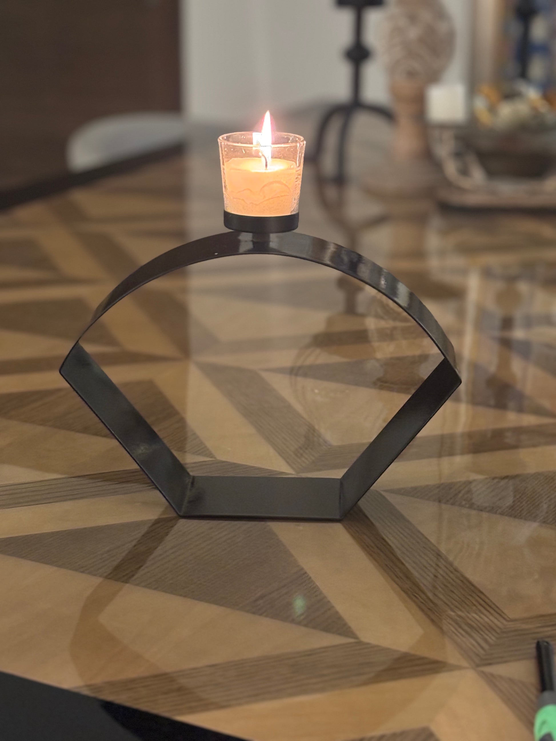 Unique as a statement accent on a console, dining table, or sideboard, it blends industrial simplicity with quiet style. A play of metal and flame!