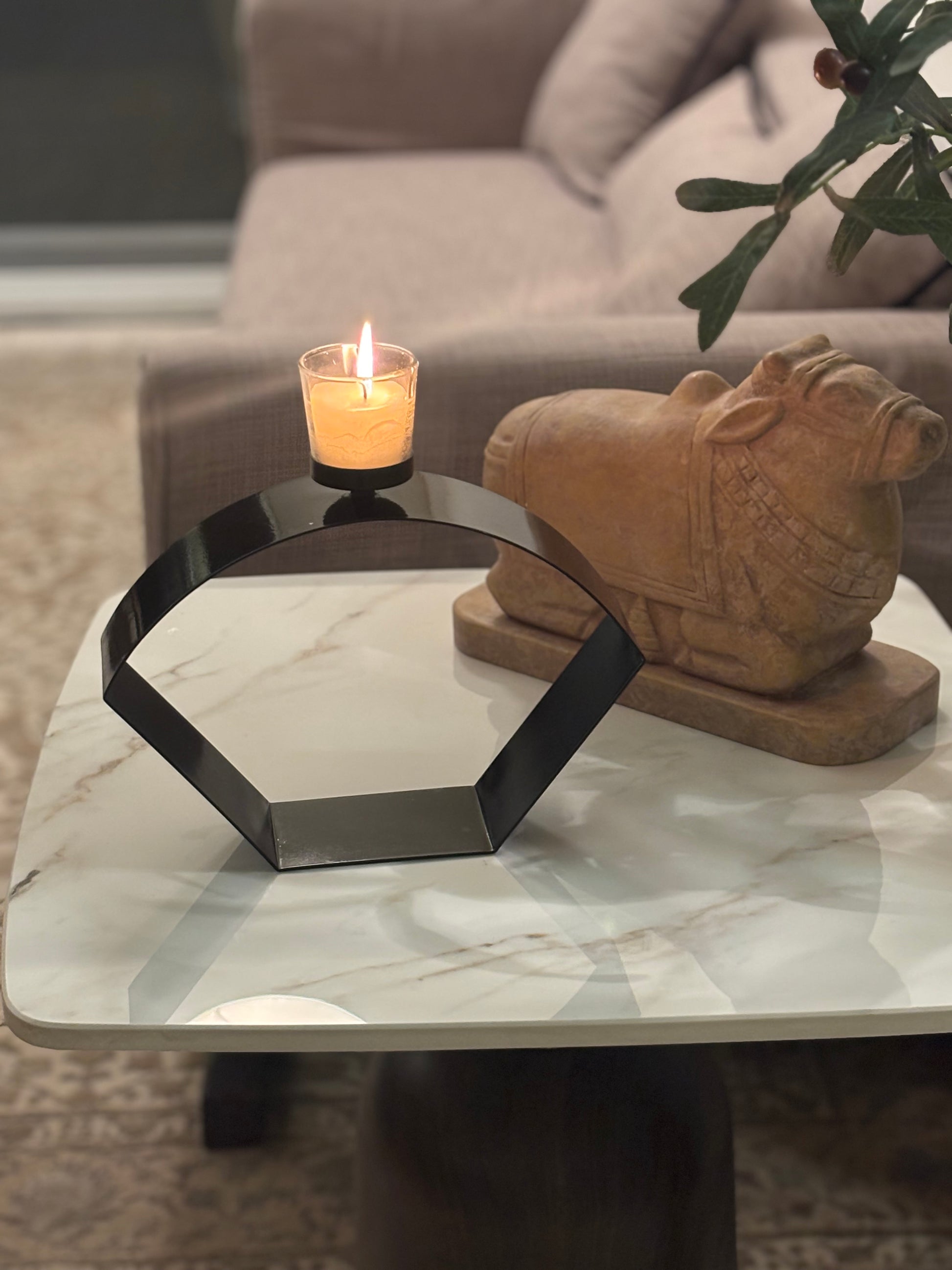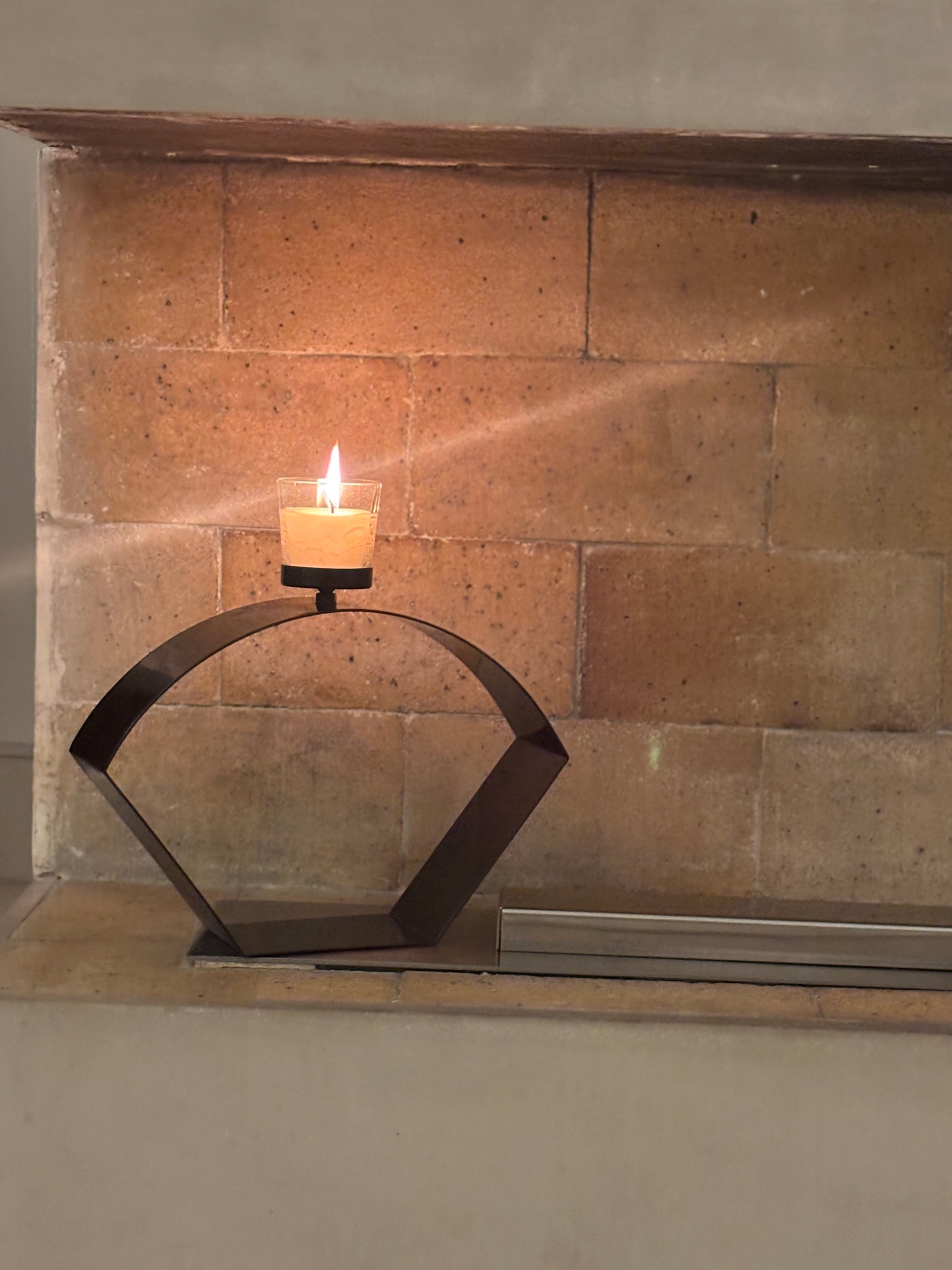 The middle form — measured, steady, and effortlessly proportioned. The Poise holds light with composure, bridging height and ground, curve and line. It’s the quiet rhythm between the extremes. This candle holder features a minimalist geometric frame forming an arch with modern angular sides. A plate to rest the candle, crowns the top.