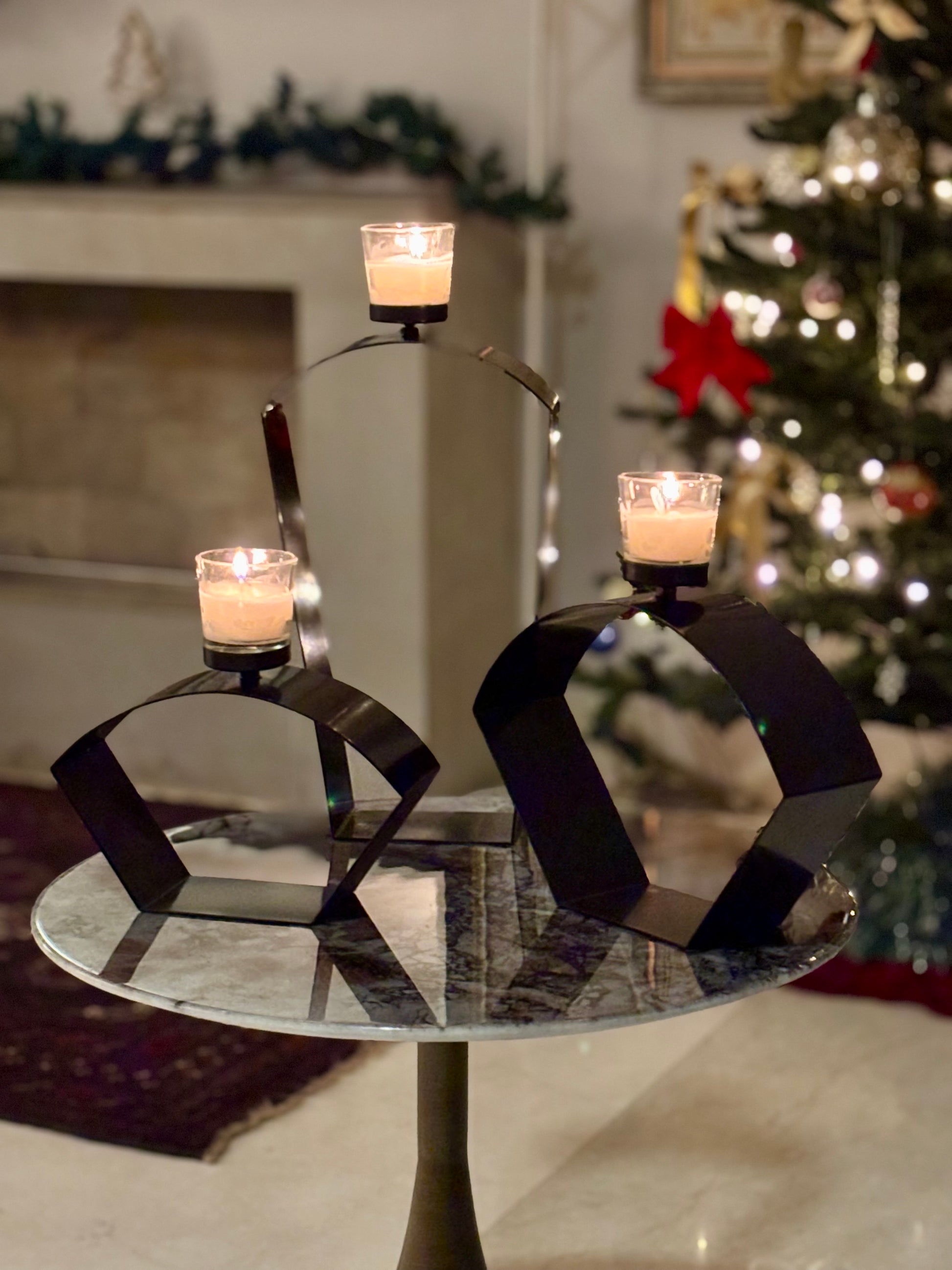 A study in proportion and pause, The Arc Ensemble pairs soft curves with defined edges. Each form rises from a quiet base to cradle a single flame — a dialogue of steel and silence. Handcrafted in a gloss deep brown metal, it stands as both sculpture and source of light, balancing geometry with grace.