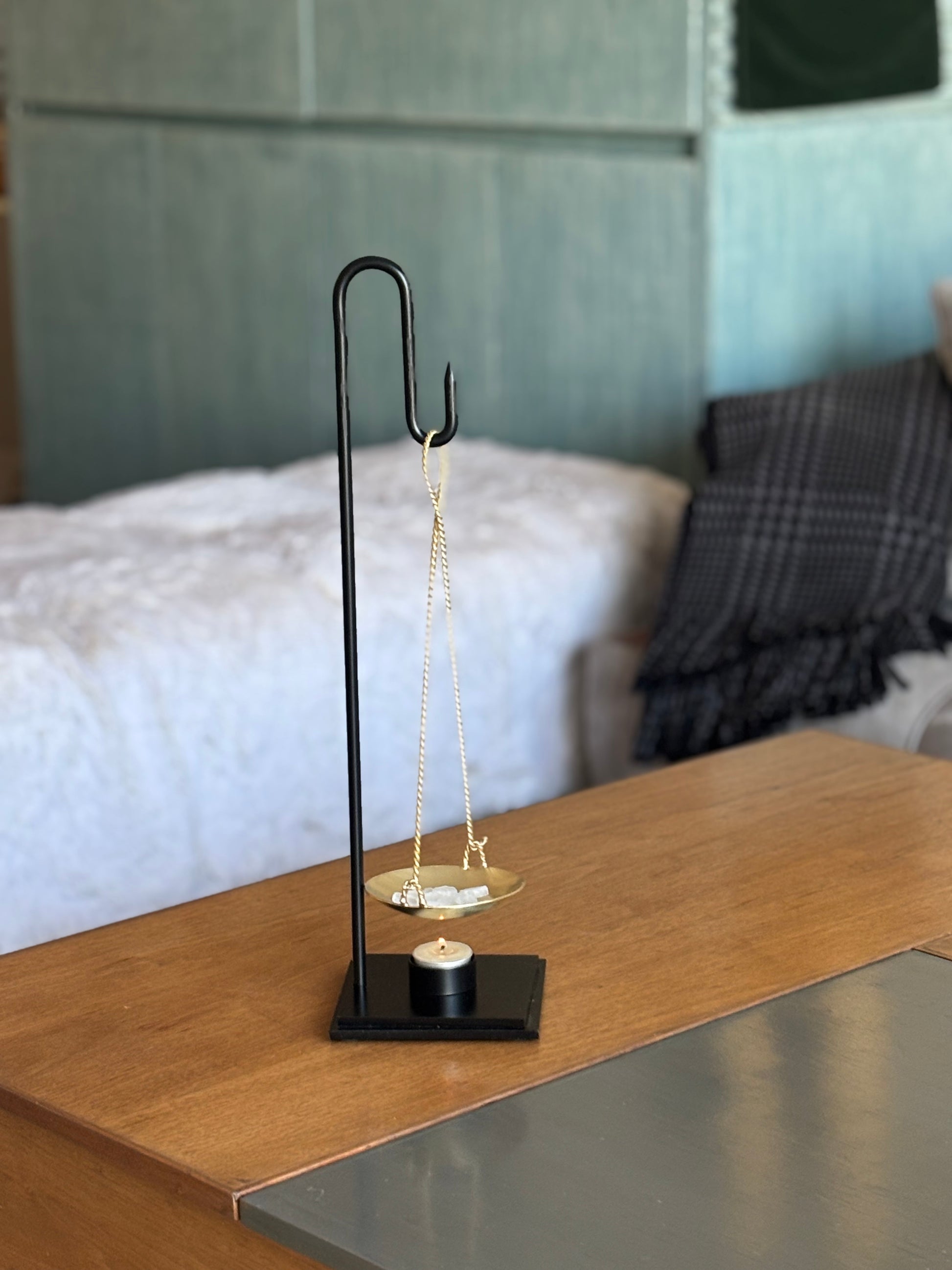 A sculptural blend of heavy matte-black metal and hand-forged brass, this burner is designed to warm camphor or essential oils with a soft tea-light glow. The tall arc stand suspends a brass plate in perfect balance, allowing fragrance to rise gently and evenly. A refined accent for meditative spaces or quiet corners of the home. As the flame warms the plate, camphor or aromatic oils release a clean, lingering scent. Its minimalist, scale-like form adds a touch of artisanal balance to any setting.