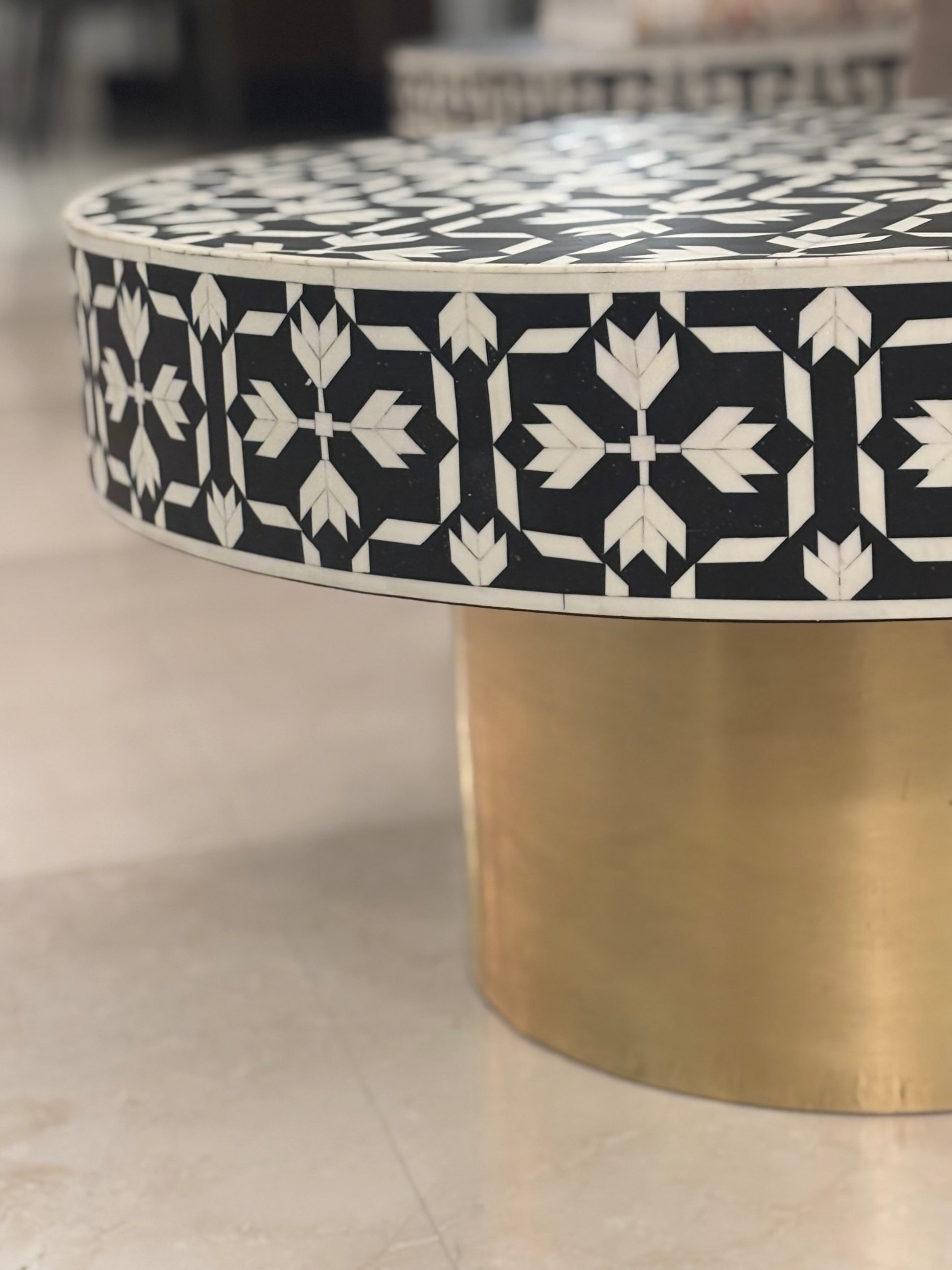 The Kora Table is bold, sculptural, and beautifully balanced. Its circular silhouette sits gracefully on a brushed gold base, bringing a touch of warmth to the striking black-and-white bone inlay. The craftsmanship shines through every detail, creating a piece that feels both timeless and contemporary.