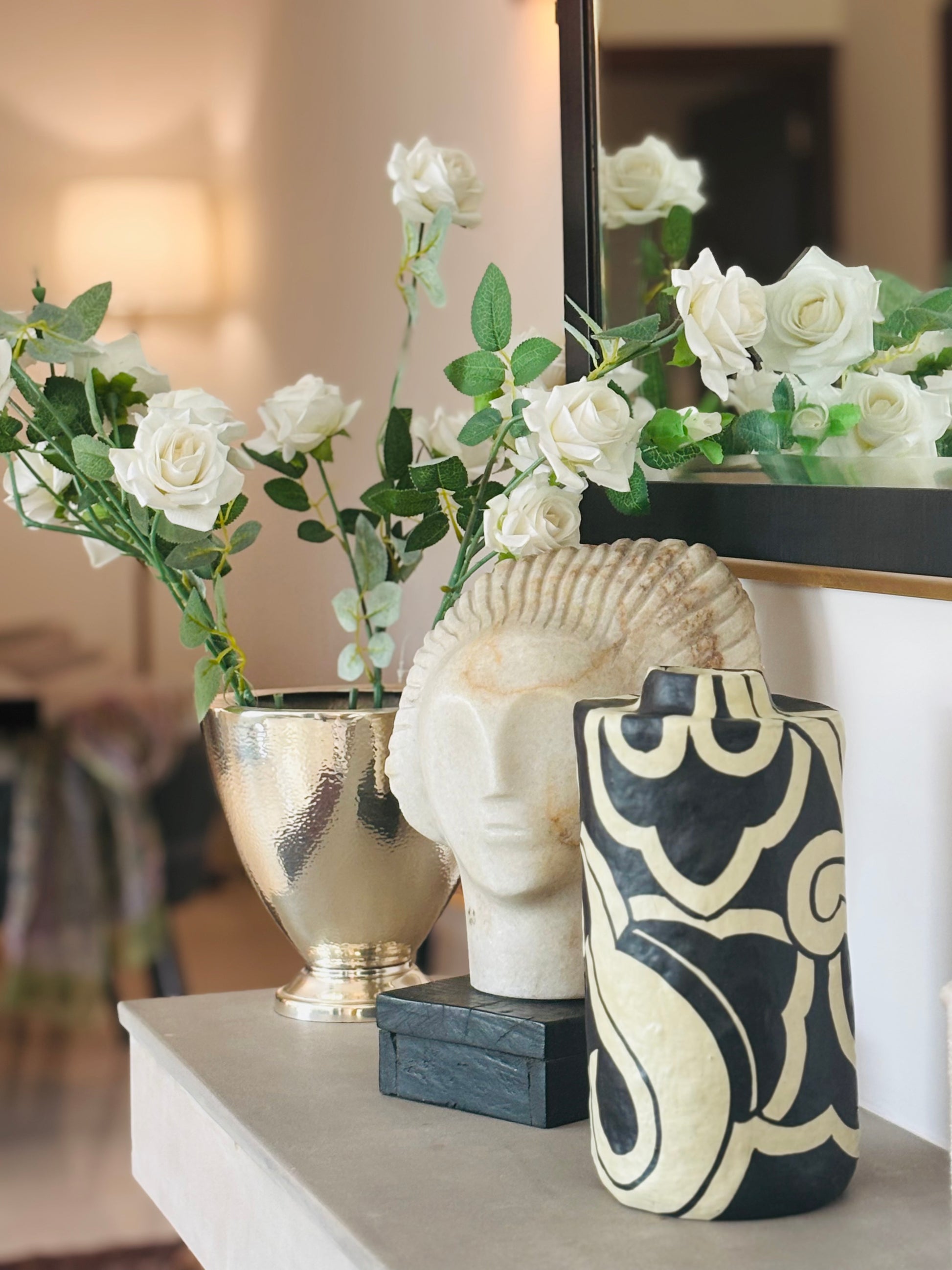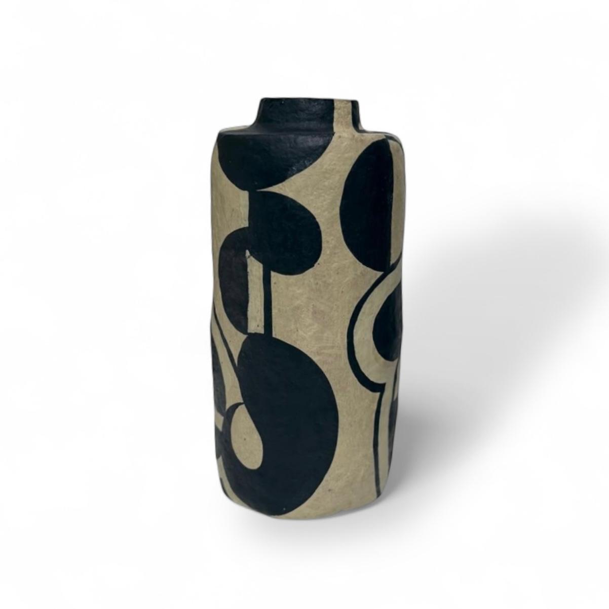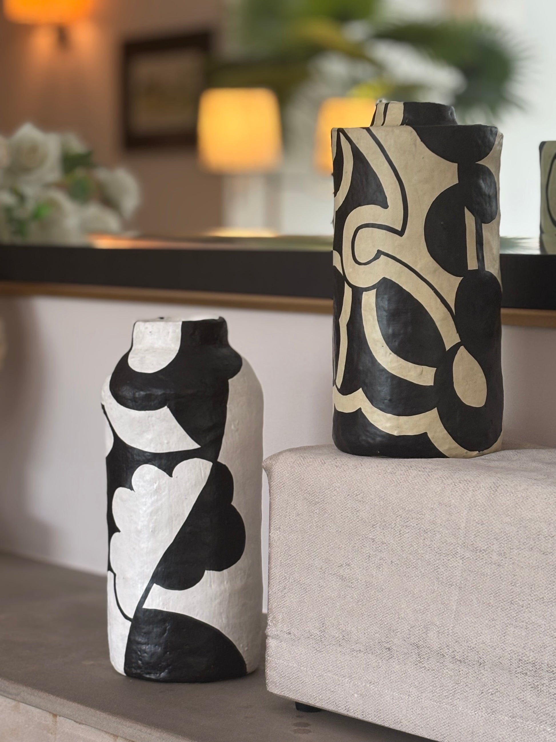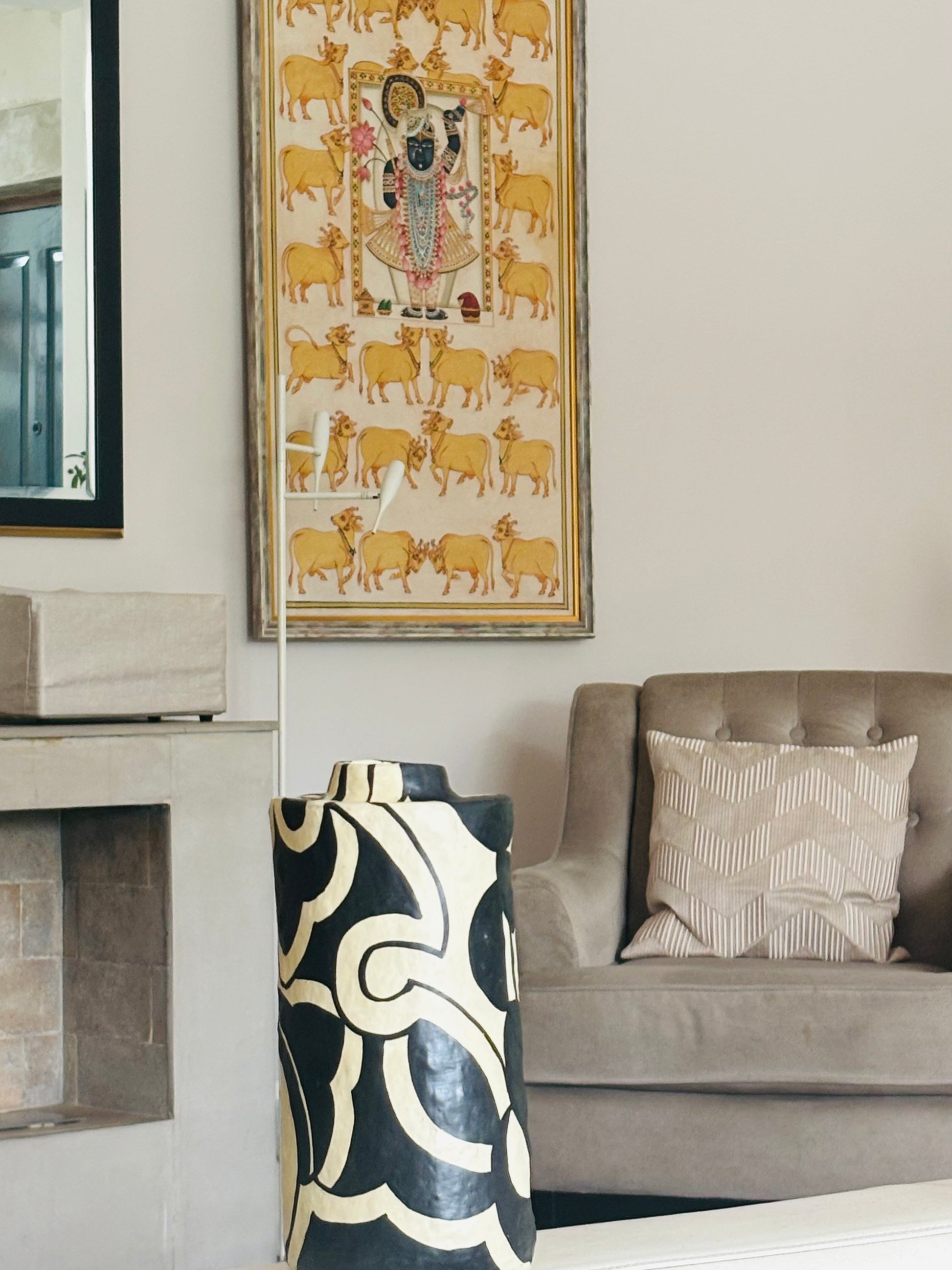 Featured paper mache pot is adorned with artistic flowing, calligraphic motifs in deep black against a muted parchment tone. The design recalls temple murals and sacred scripts that frame the stories of Shrinathji in Pichwai tradition. With its organic silhouette and heritage-inspired detailing, it lends a quiet gravitas and timeless elegance to any setting.