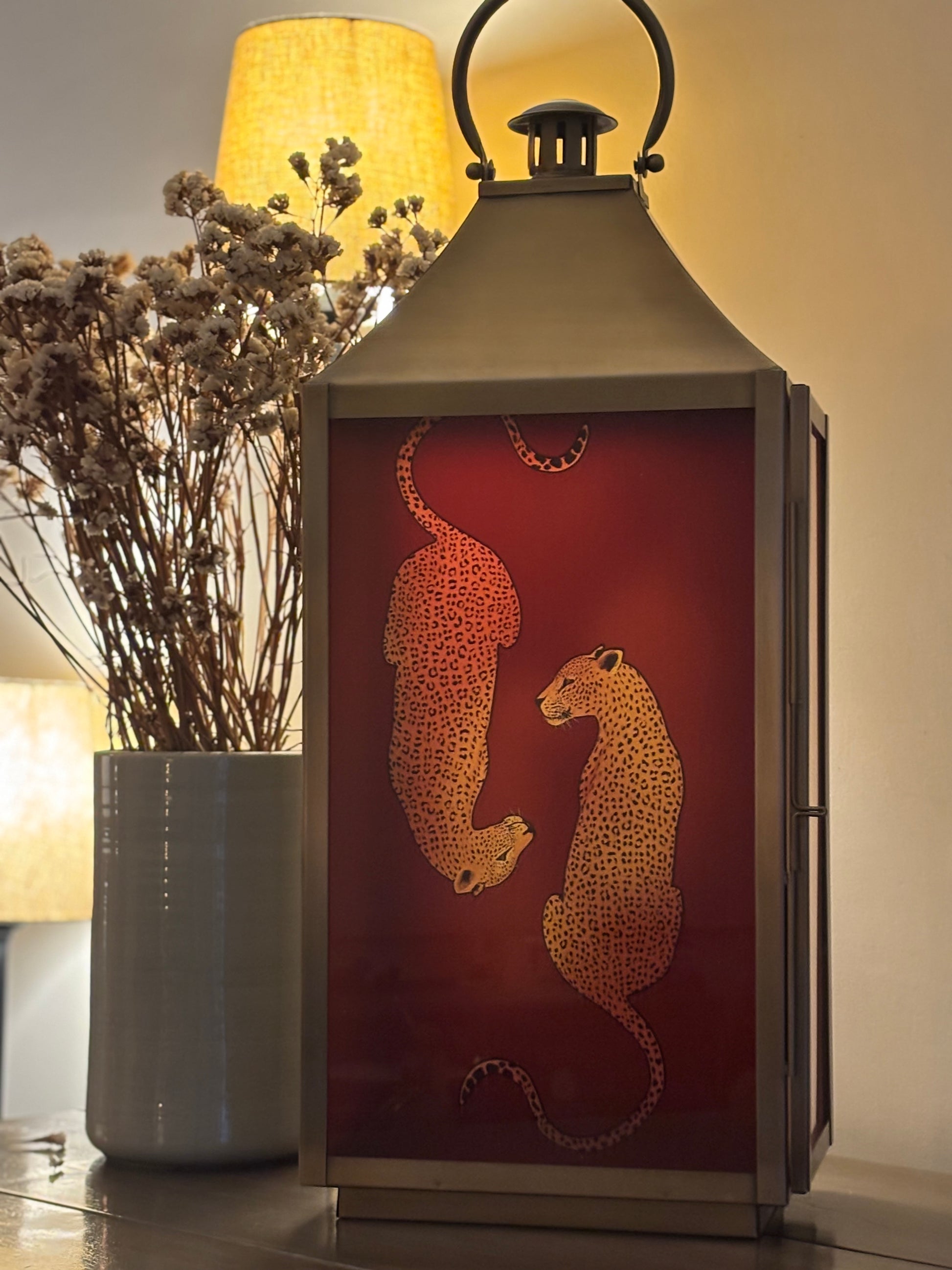 The Wild Ember Leopards Lantern is a part of the August Illumine Art Collection that celebrates the quiet power and mystique of the wild. Two golden, hand-speckled leopards rest in mirrored poise against a deep ember-red base, creating visual movement and drama.